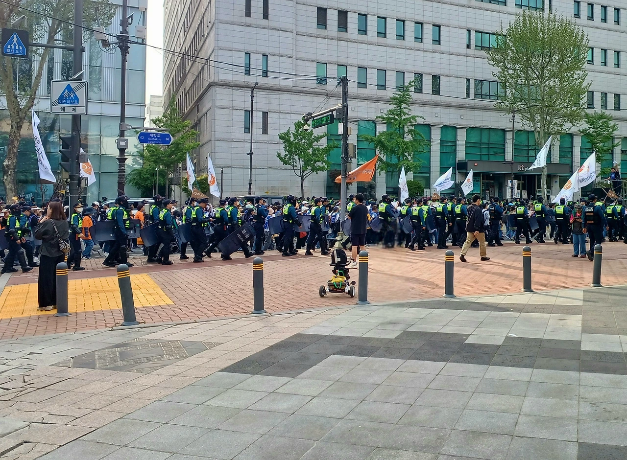 양옆으로 보호구를 착용한 경찰이 호위하듯 나란히 걸었다.