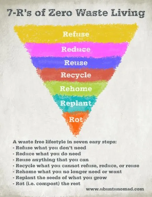 제로 웨이스트 운동의 창시자이며『나는 쓰레기 없이 살기로 했다』의 저자인 비존슨(Bea Johnson)은 “가정 내 쓰레기 줄이기는 다섯 가지 단계를 따르면 상당히 쉽고 간단하다”라고 말한다. 그녀는 일상생활에서 실천하는 ‘5R’을 강조한다. 필요하지 않은 것은 거절하고(Refuse), 필요하며 거절할 수 없는 것은 줄이고(Reduce), 소비하면서 거절하거나 줄일 수 없는 것은 재사용하고(Reuse), 거절하거나 줄이거나 재사용할 수 없는 것은 재활용하고(Recycle), 나머지는 썩히는 방식으로 퇴비화(Rot)하는 것이다.