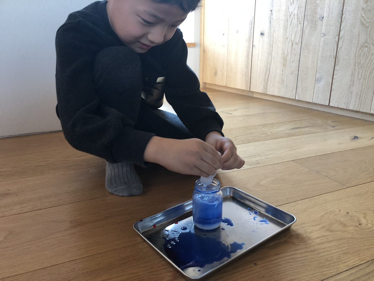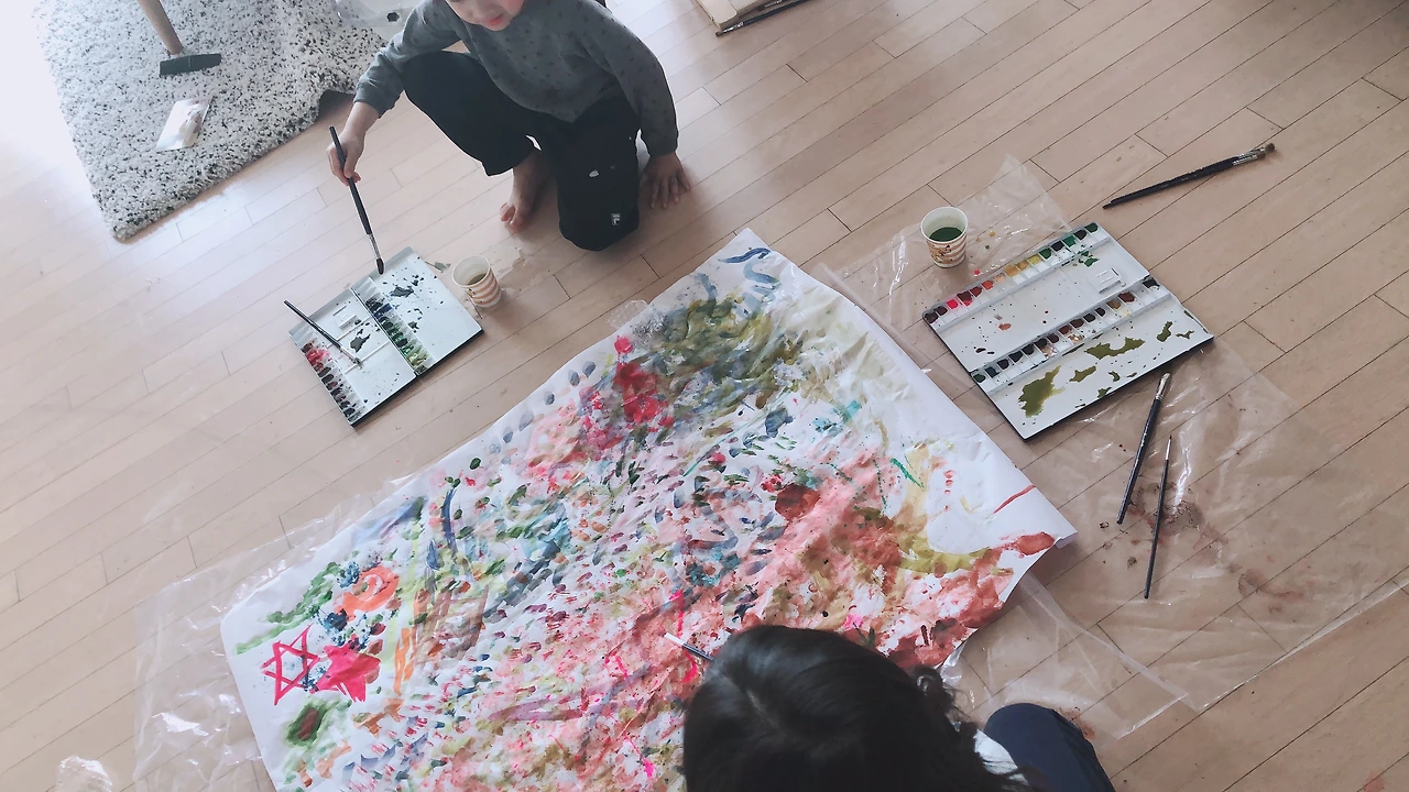 전지 하나 시원하게 깔아놓고, 맘껏 물감을 뿌려 봅니다. 일은 번거로운데, 30분짜리 놀잇감이라니 아쉽 ㅠㅠ