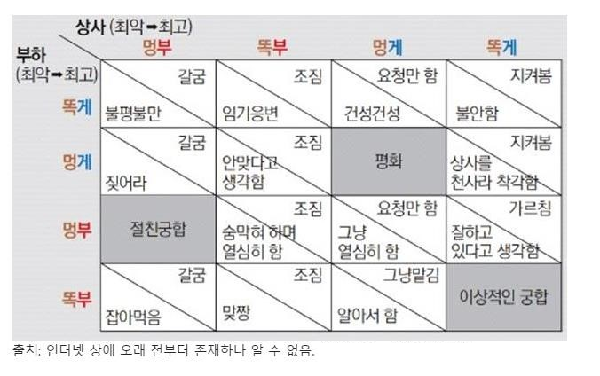 책임감과 성취욕구가 강하고 실행력도 높습니다. 여기까지는 참 좋은데, 유연성과 포용력이 떨어지면서 자기 확신까지 강하면 소위 '멍부'형 상사가 됩니다.
