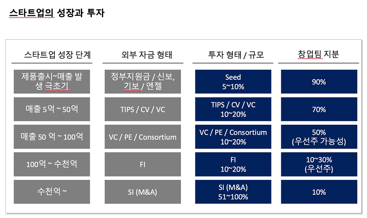 다만 보통 재무적 투자자들은 리스크 관리 차원에서 한 스타트업에 한꺼번에 지분율 수십%를 가져가는 경우는 흔치 않으며, 전략적 투자자들 역시 초기 스타트업에 대규모의 지분을 가져가는 경우는 M&A를 하는 경우 정도입니다. 즉, 각 투자 라운드별로 투자자들의 투자 규모는 해당 스타트업 지분의 10~20% 정도인 경우가 일반적이라는 것이지요.