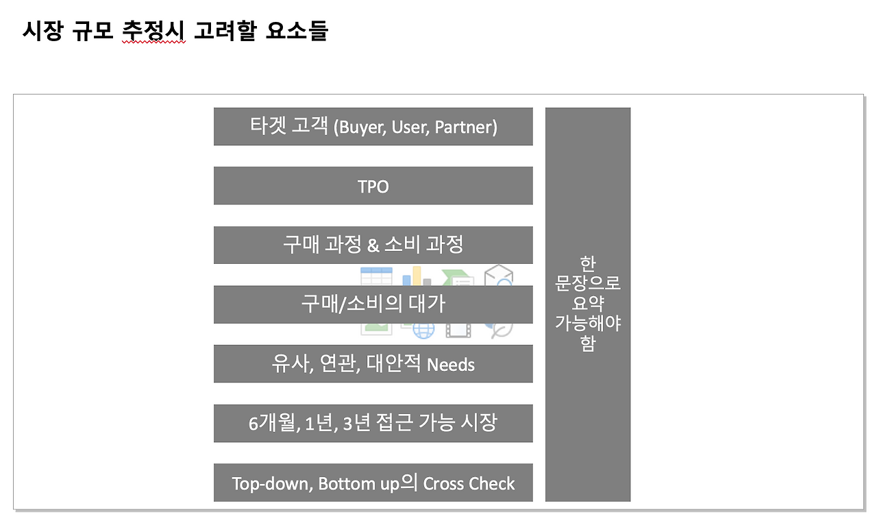 그래서 비교적 소수의 기업이 명확하게 정해진 소모량을 사용하는 B2B 시장이 아닌 B2C 시장의 규모를 추정하는 것은 세세한 숫자보다도 고객에 대해 얼마나 다양한 시각에서, 얼마나 자세히, 얼마나 오랫동안 들여다보고, 확인해봤느냐를 보여주는 지표가 되기도 합니다.