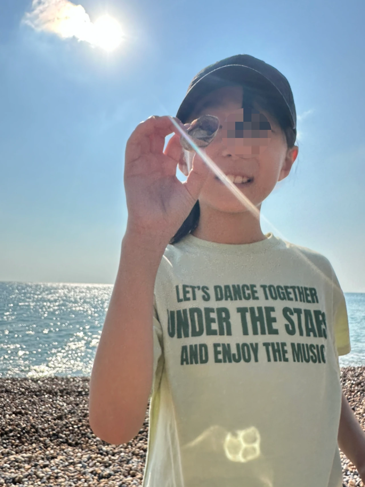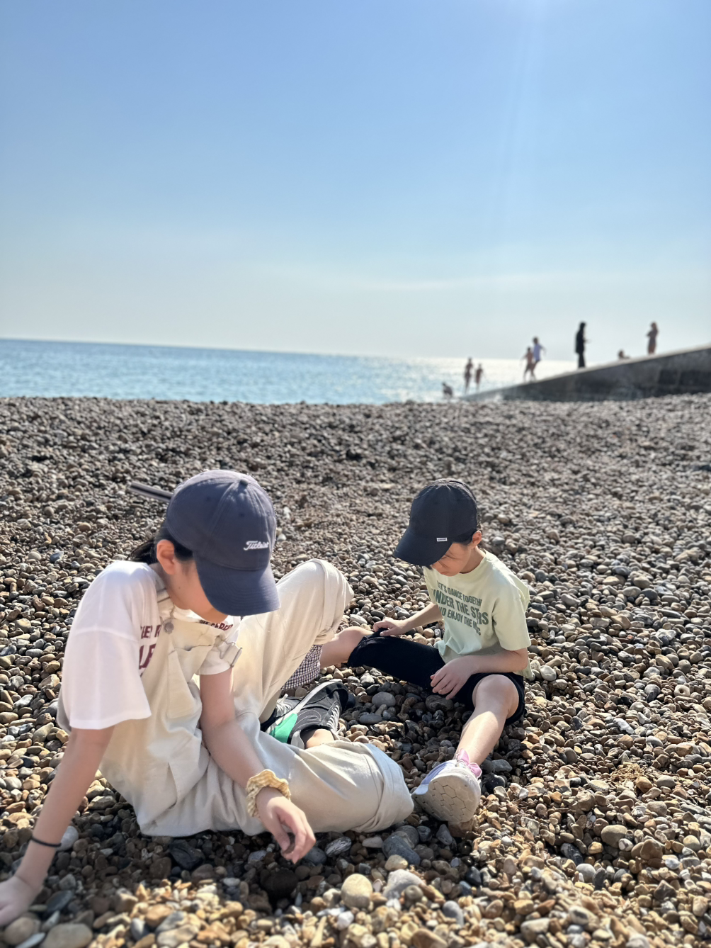 한참을 반짝이는 바다를 보며 앉아있다가, 2호는 바다 가까이로 가 홍합을 찾아냈다. "엄마! 나 그 짬뽕에 많이 들어있는거(홍합) 그거 살아있는 걸 찾았어!" 라며