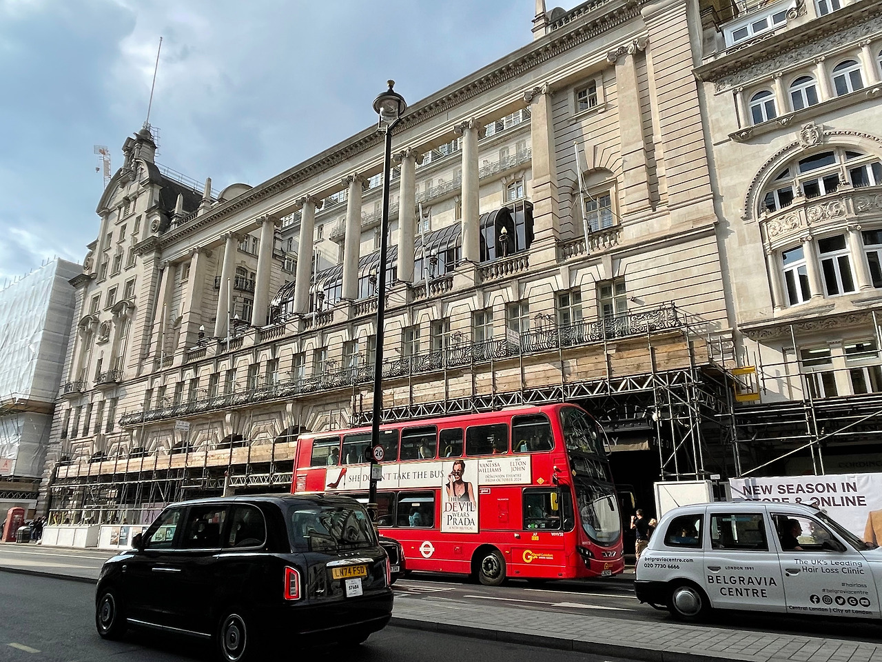 The Dilly Hotel 전경. 빨간버스 뒤에 출입문인데, 외벽 공사중이었다.