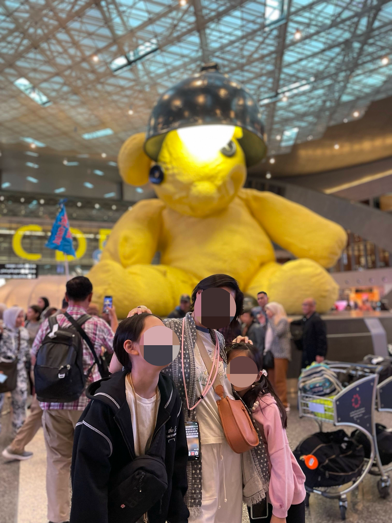 도하공항의 마스코트 같아 보이는 노랗고 거대한 곰돌이 조형물 앞에서 인증샷 찍고,