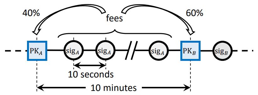 비트코인에서는 리더 선택이 무작위로 그리고 드물게 수행된다. 일단 리더가 선택되면, 새로운 리더가 선택될 때까지 트랜잭션을 일방적으로 직렬화할 자격이 주어진다. 이러한 접근 방식은 비트코인 운용에 중요한 출발점이다. 암묵적으로 리더 선출(선택)은 비트코인에서 이미 일어나고 있다. 그러나 비트코인에서의 리더는 히스토리의 직렬화를 담당하여, 리더 선출 사이의 전체 기간 동안 긴 시스템 동결을 만든다.