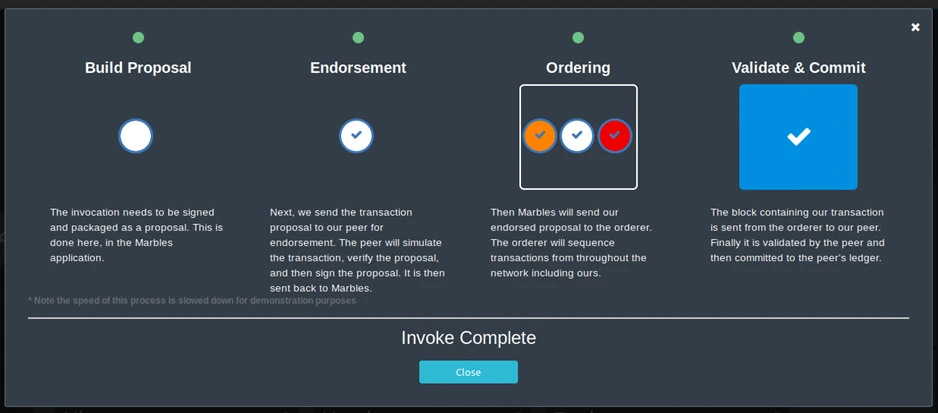 위 그림은 하이퍼레저 패브릭 예제들 중 하나인 Marbles라는 예제의 애플리케이션 흐름이다. Marbles와 같은 dapp을 통해 사용자들은 패브릭 네트워크의 peer에 접근해 체인코드를 실행시켜 원장을 업데이트할 수 있다. Marbles는 asset의 이동을 시연한 애플리케이션으로, 아래 그림처럼 트랜잭션의 처리 과정을 알아볼 수 있는 기능도 제공한다.