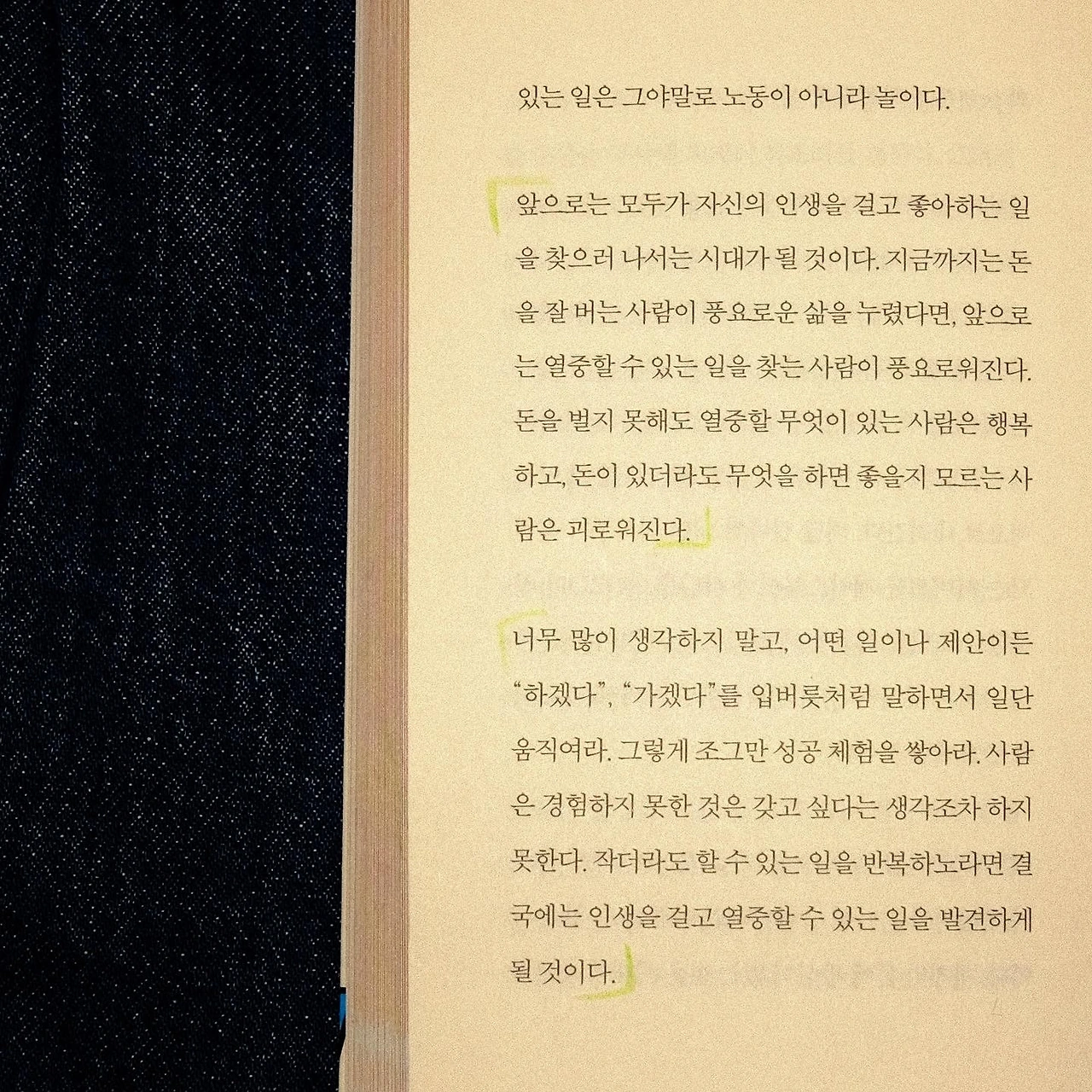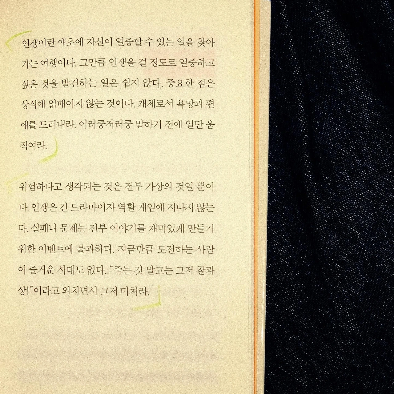 사실 말이 쉽지, '미치도록 좋아함'엔 많은 노력이 필요하다. 소비 취향도 싫증 나는데 생산하는 일에서 미친 듯이 좋아해야 한다니. 그래서 책이 일에 대한 마음가짐과 팁을 다룬 이유도 그저 일을 잘하기 위함 보단 잘 좋아하기 위하는 맥락에서 이해하는 게 좋겠다.