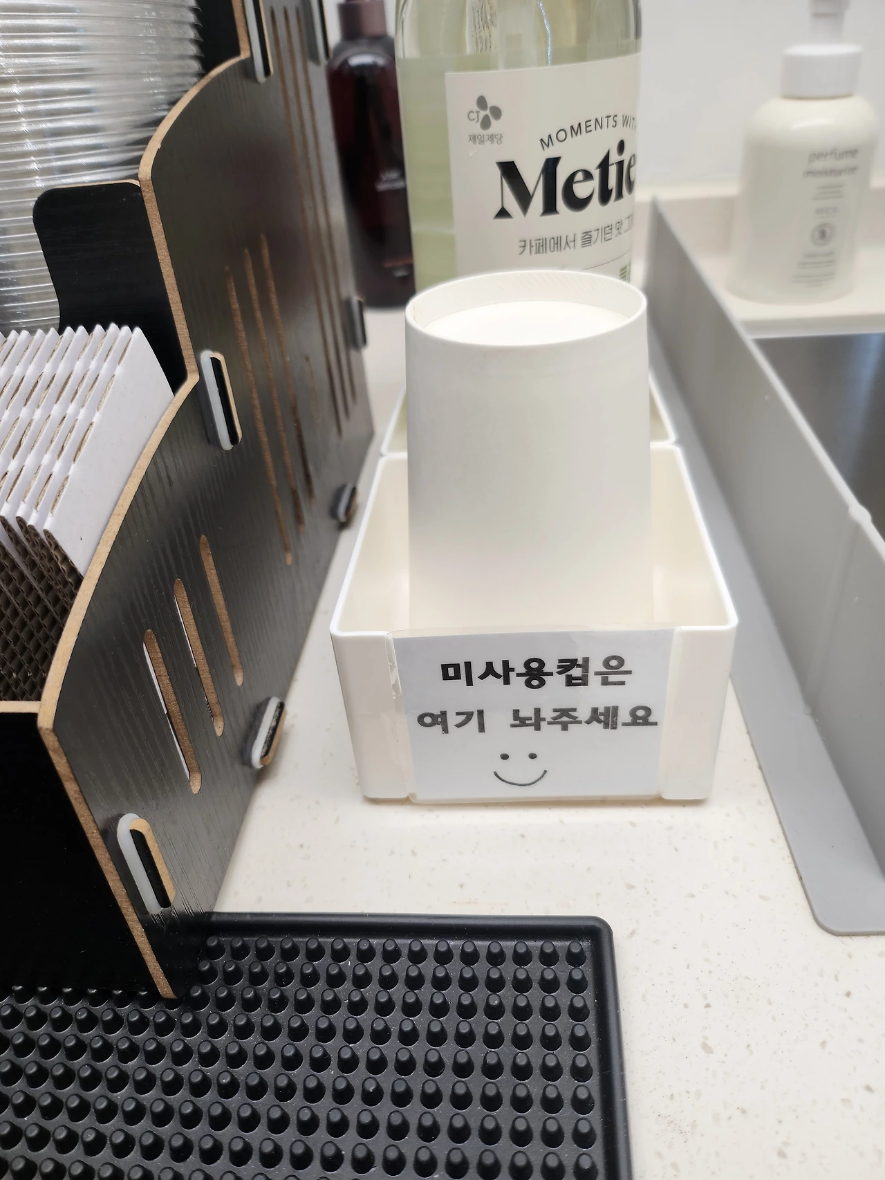 무인카페는 으레 일회용 컵을 쓸 수밖에 없는 시스템이지만, 이곳 무인카페는 최신식 기계가 아니라서 컵이 나오면 내가 커피 내리는 기계 앞에 갖다 놓고 기다려야 하기 때문에 텀블러사용이 가능했다. 하지만 무엇보다도 더 가능한 것은 사장님 개인적인 의지인지 아니면 민원을 받아들인 결과인지 모르지만, 쓰지 않는 일회용 컵을 별도로 보관하는 곳을 마련해 놓고 필요한 사람이 쓸 수 있도록 한 이곳만의 텀블러 친화적 시스템 덕분이었다. 그래서 나 같은 텀블러예찬자도 무인카페 단골로 만들어버렸다. 물론 울며 겨자 먹기로, 우리 동네에는 그럴싸한 카페도 없고, 대기시간 동안 어디 가 있을 곳이 없기에 차선으로 선택한 장소였지만 그래도 마음 편하게 머무를 수 있어 감사하다.