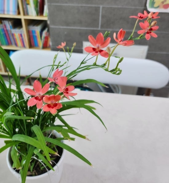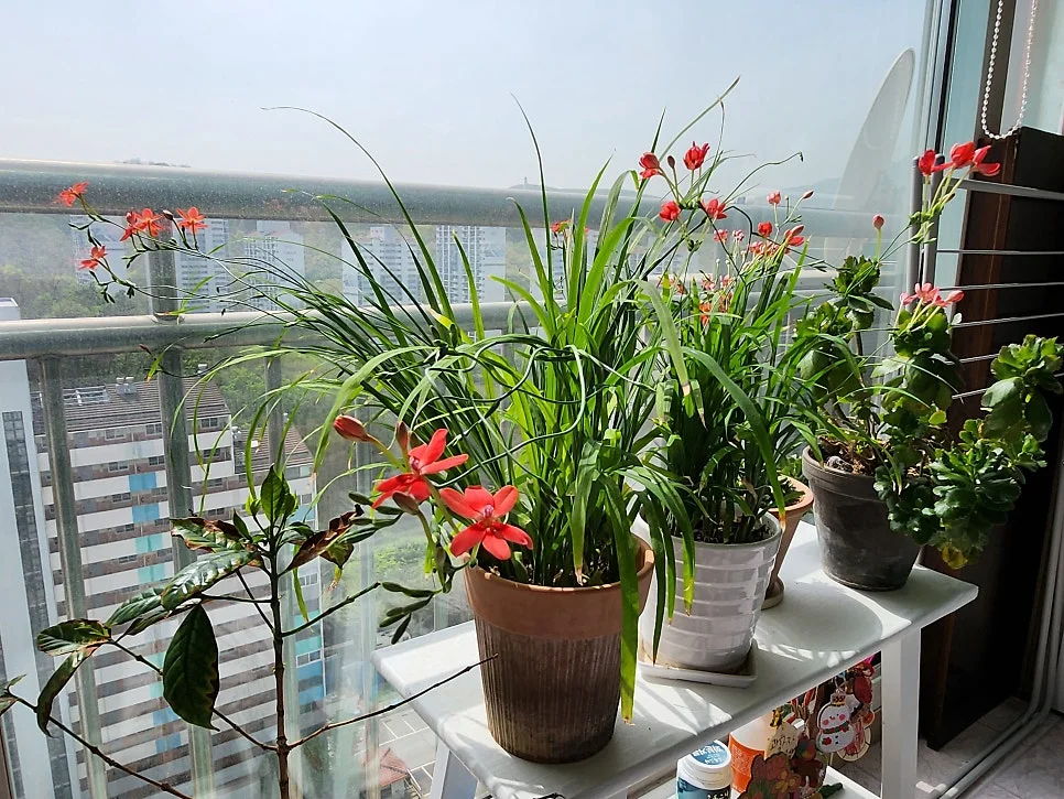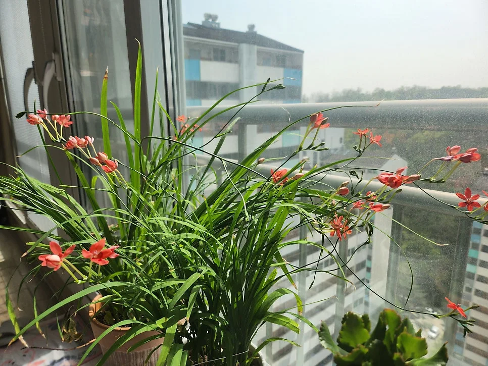 그렇게 거실베란다에는 아기범부채 화분이 2개가 되었다. 비실비실하던 아기범부채만 보다가 싱싱하고 제법 화려하게 나온 아기범부채를 보니 기분이 좋았다.