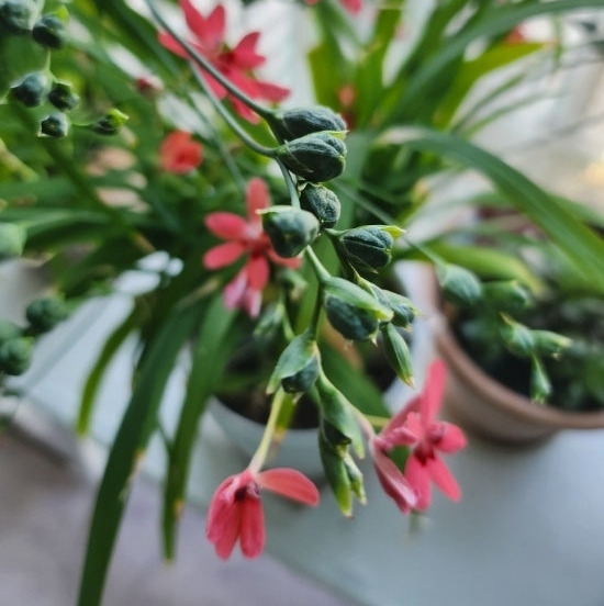 화초에 대한 지식이 전무해서 그런 건지 아기범부채의 번식은 진짜 신기하다. 아기범부채는 씨앗으로도 번식하고 뿌리? 로도 번식하는 재미있는 화초다. 아기범부채는 죽은 듯이 땅속에 있다가 2월부터 싹이 나기 시작하고, 4월~5월 반짝 꽃이 피다가 지면 꼭 무슨 벌레알 같은 짙은 팥죽색의 씨앗들이 주렁주렁 달린다. 들풀 같은 잎사귀를 같진 범부채는 머리에 큼지막하게 달리는 씨앗들 때문에 축축 늘어진다. 그럼 나는 그 씨앗들이 익어서 톡톡 터져나갈까 봐 석류알처럼 주렁주렁 아슬하게 매달려있는 씨앗들을 받아 놓곤 한다.