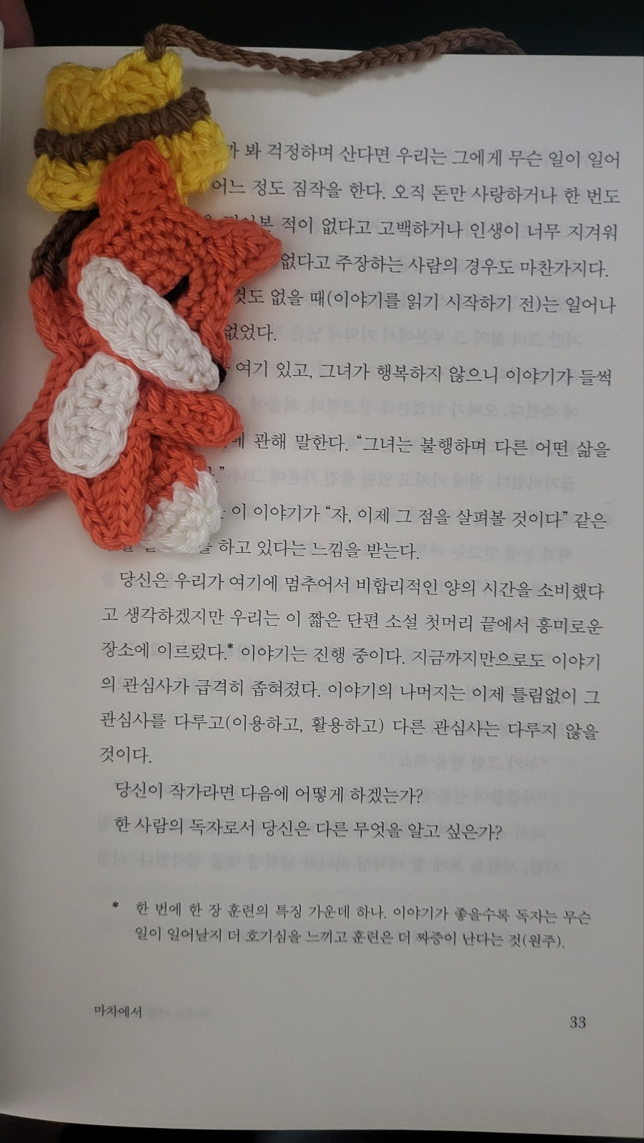 고놈 눈은 맹한 듯 날카롭고 주둥이는 뭉툭한 듯 두툼한 것이 오동통한 여우가 틀림없으렷다. 여자친구의 선물은 예쁘게 떠진 여우 책갈피였다. 사귀기 시작했을 때부터 써왔던 모롱 작가님의 여우 이모티콘, 그리고 마이카 작가님의 여우 이모티콘이 생각나 선물해 줬다나. 받아본 후의 첫 소감은 대만족이다.