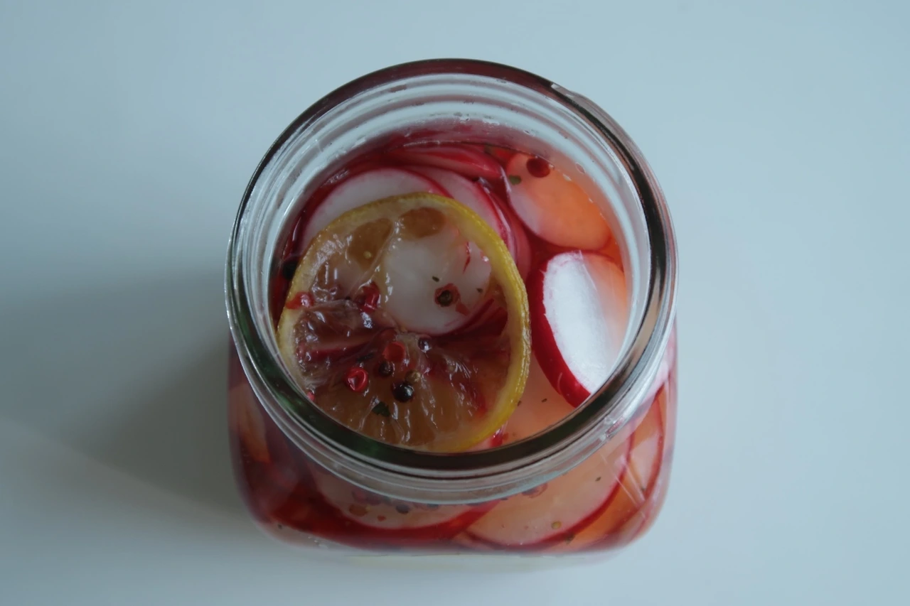 피클 절임물이 뜨거울 때 유리병에 부어야 래디시의 아삭한 식감이 살아있어요.