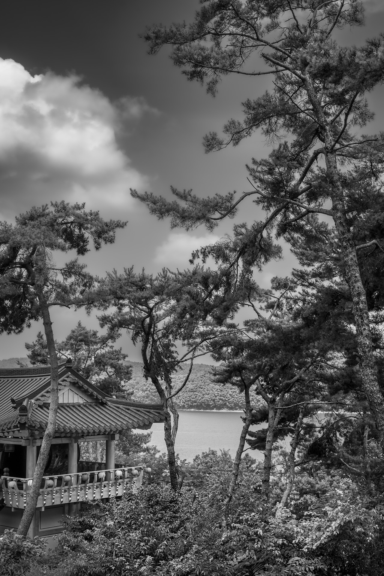 [흑백으로 담긴 동도사의 전경. 화면 왼쪽에는 전통적인 사찰 건물의 처마가 자리하고, 그 뒤로 굽이치는 소나무 가지들이 하늘을 향해 뻗어 있습니다. 소나무 사이로 잔잔한 저수지와 먼 산의 능선이 보이며, 하늘에는 구름이 입체감 있게 흐르고 있습니다.]