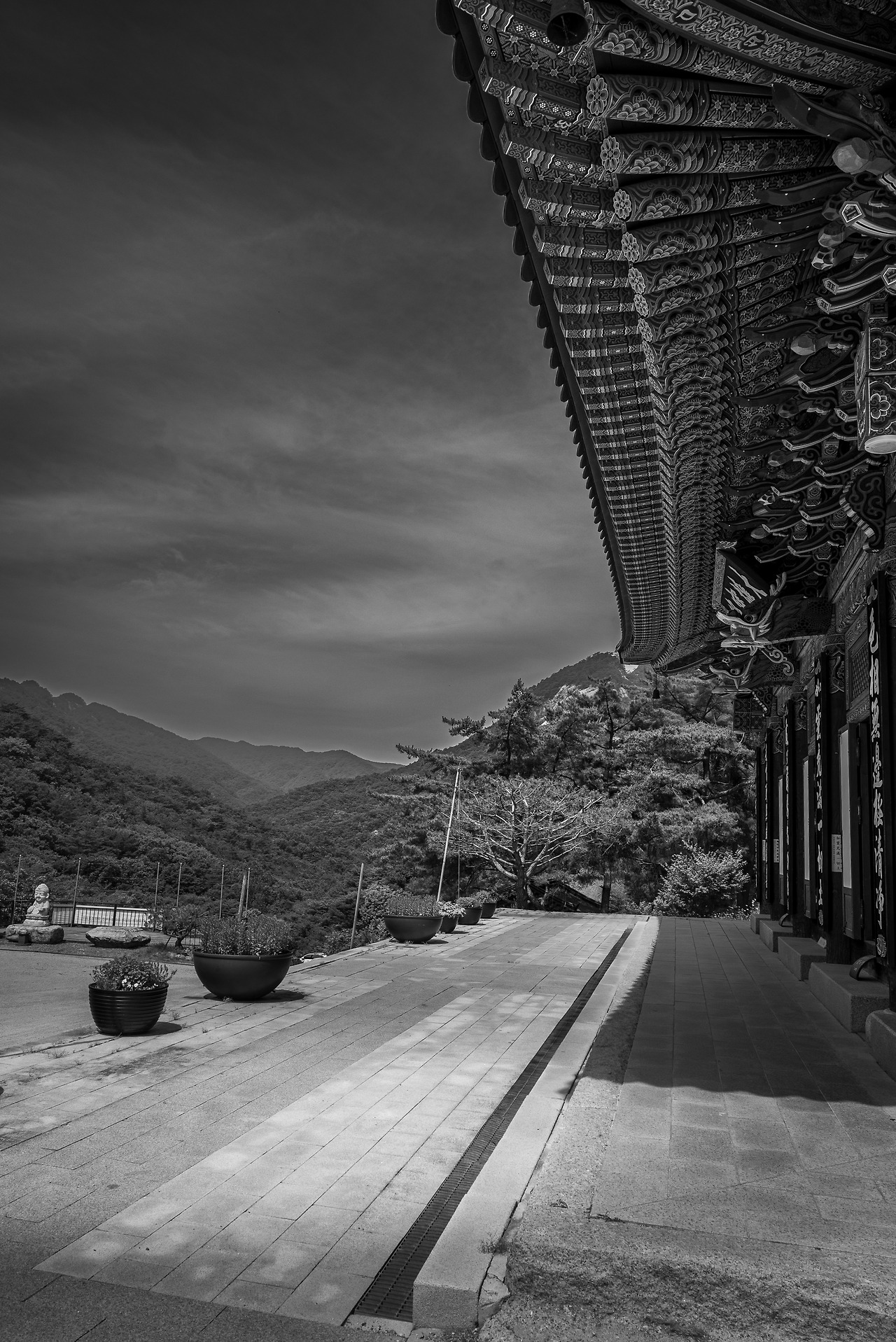 [흑백으로 담긴 덕주사 처마의 유려한 곡선과 그 아래로 펼쳐진 월악산의 능선, 그리고 정적을 머금은 마당의 풍경]