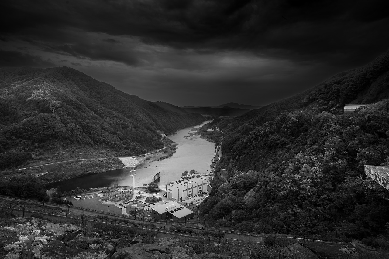 눈 앞에 펼쳐진 산맥의 능선들은 빛을 등진 채 검은 실루엣으로 서 있고, 인공의 구조물과 자연의 곡선이 기묘한 조화를 이루며 얽혀 있습니다. 1973년, 자갈과 진흙을 다져 쌓아 올린 이 거대한 사력댐은 단순한 치수의 현장을 넘어 지난 반세기 치열했던 역사의 흔적처럼 느껴집니다. 저 깊은 물 속에는 댐이 건설되면서 고향을 떠나야 했던 수많은 수몰민들의 잊혀진 이야기와 그리움이 잠겨 있을 것입니다. 뷰파인더를 통해 본 세상은 화려한 색채 대신, 오직 명암으로만 기록되는 깊은 침묵의 세계였습니다.