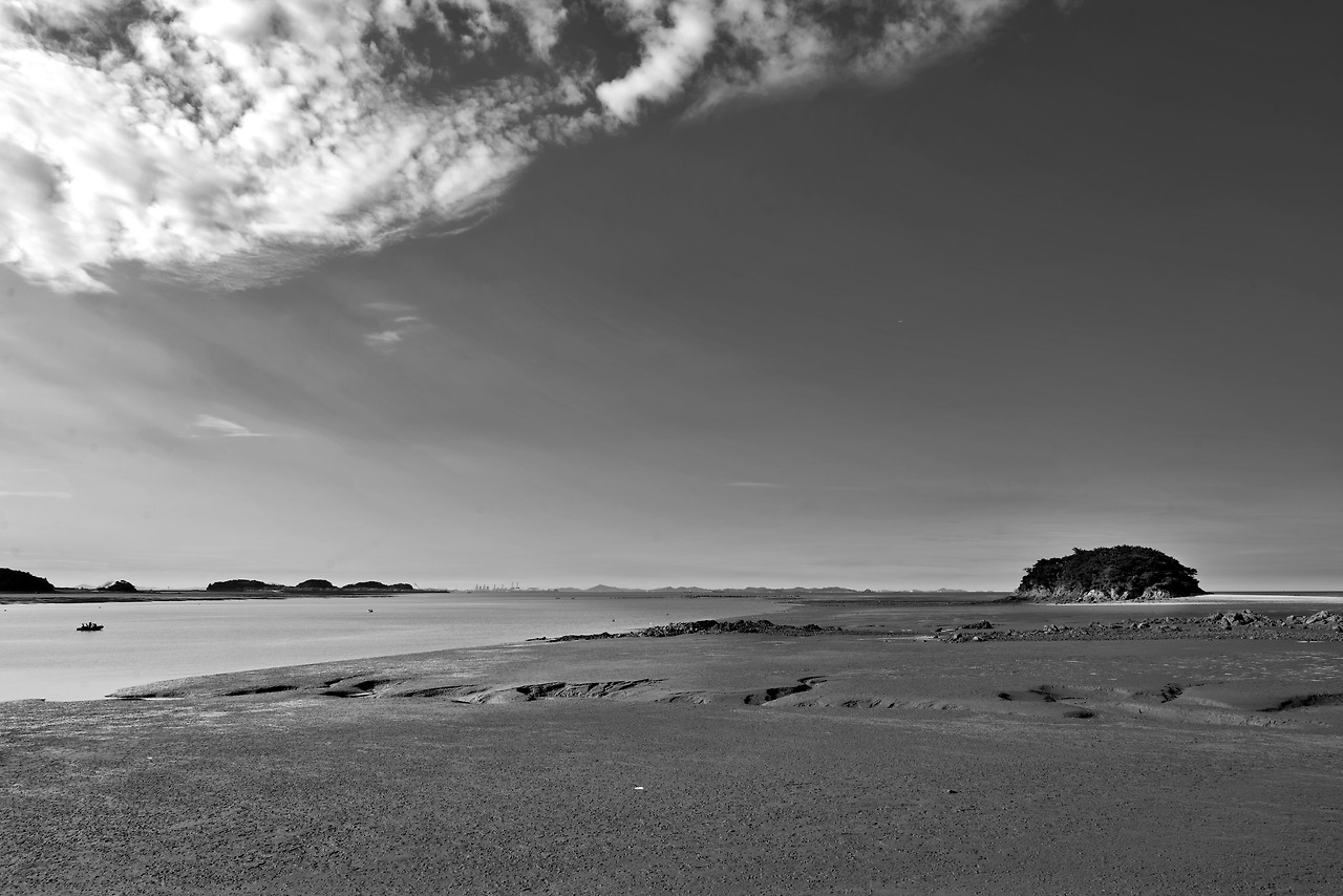 이곳 영흥도의 시계바늘은 수평선 너머 육지의 세상보다 한참이나 느리게 흐르는 듯합니다. 하늘을 수놓은 무거운 구름과 끝없이 펼쳐진 갯벌의 거친 질감이 깊고 차분한 조화를 이루며 광활한 자연의 생명력을 뿜어냅니다. 화면 좌측으로 조업을 나선 작은 배가 느릿하게 움직이고, 저 멀리 아스라히 보이는 현대적인 송전탑과 발전소의 실루엣마저 옅은 해무에 가려져 몽환적인 분위기를 자아냅니다. 우측에 홀로 오롯이 솟아 있는 작은 섬 목섬은 오랜 세월 풍파를 견뎌낸 고독하고도 굳건한 파수꾼처럼 보입니다. 이 텅 빈 듯 가득 찬 여백의 풍경 속에서, 발걸음이 닿는 곳마다 낡은 기록의 냄새가 물씬 피어오릅니다.