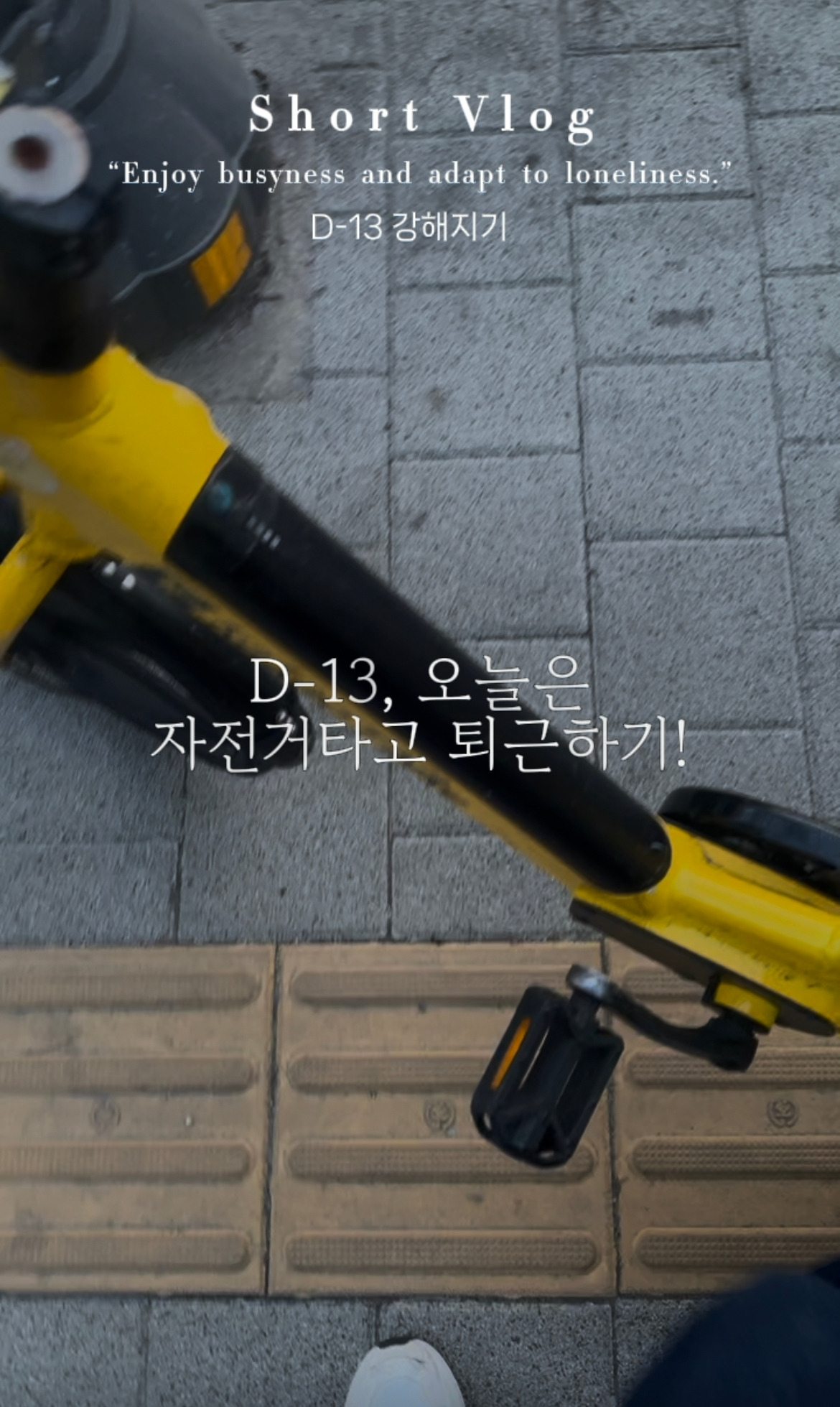 그럭저럭 오늘까지 도전들을 하는 요즘의 나는 잘 밟아가고 있다. 여전히 불안한 하룻밤을 보낸 적도 있었고, 너무 귀찮아서 억지로 밖을 나간 날도 분명 있었다! 하지만 어떻게든 내 몸뚱이를 일으켜보았다. 완벽하진 않지만 만족스런 나의 모습들을 마주했다. 그리고 D-13인 오늘은 잠깐이나마 새로운 감정을 맛봤다.
