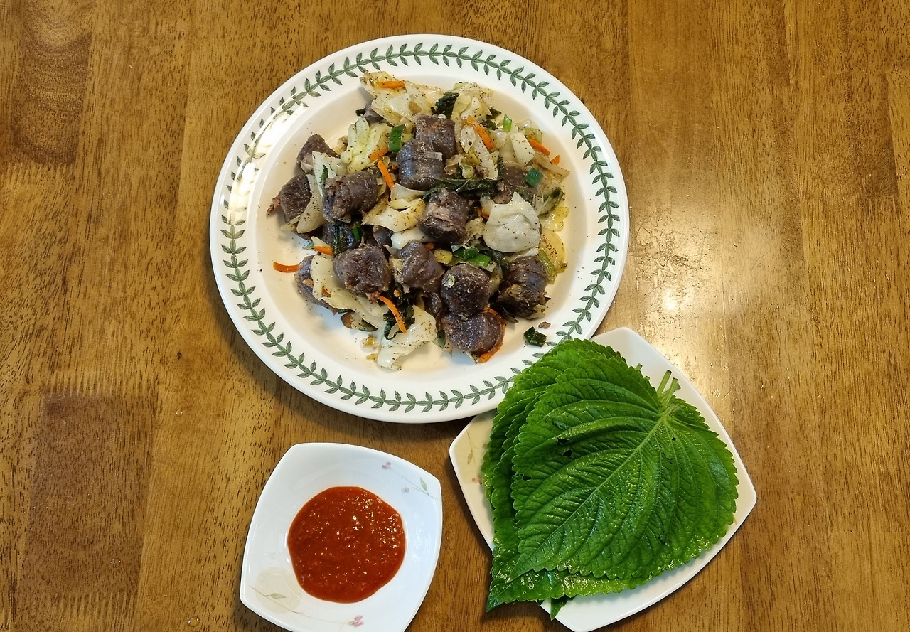 "이렇게 먹어봐. 진짜 죽음의 맛이야!!" 라면서 연신 쌈을 싸서 입에 구겨 넣었다. 나도 알려준 대로 똑같이 깻잎에 싸서 먹었다. 사실 나는 그전에 깻잎을 그다지 좋아하는 취향의 소유자는 아니었다. 그런데 그렇게 싸서 한 입 먹자, 백 순대는 반드시 깻잎에 싸 먹어야 한다는 진리의 의미를 깨달았다.