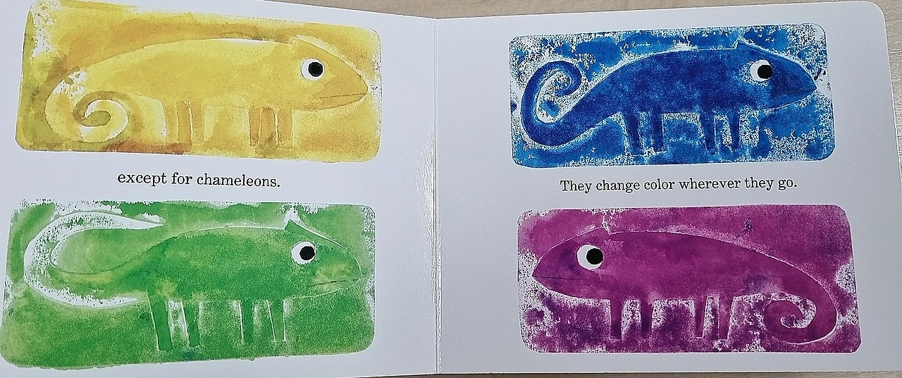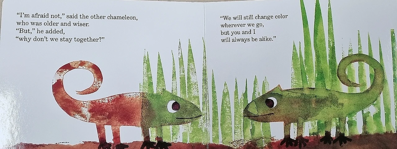 어린 시절 동물을 좋아했던 레오의 그림책에는 주로 동물들이 주인공으로 등장한다. 이 그림책에서는 카멜레온이 주인공이다. 주변 환경에 따라 자신의 색깔이 따라서 변하는 것을 자각한 카멜레온은 어느 날 '왜 나는 나만의 색깔이 없는 걸까'를 고민하기 시작한다.