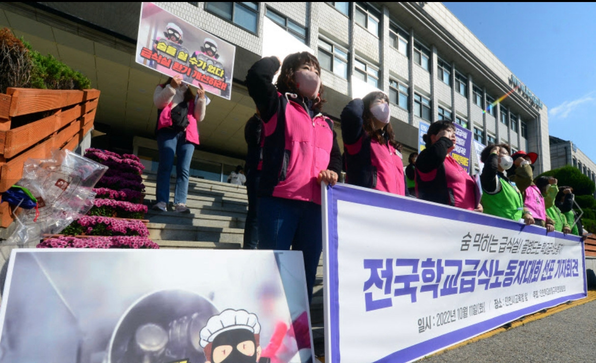 급식실 노동자들의 폐암 발생률은 비슷한 성별과 연령대와 비교해 35배에 달한다고 한다. 얼마 전에는 급식실에서 갑자기 쓰러진 조리사가 8일 만에 숨지는 안타까운 사건도 있었다. 급식실 환기 시설에 대한 구체적인 기준이 없기도 하고 적합한 기준을 충족하는 학교도 드물다고 한다.