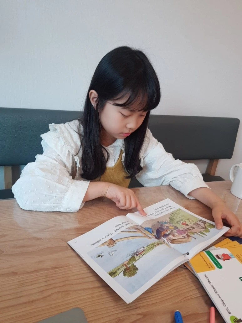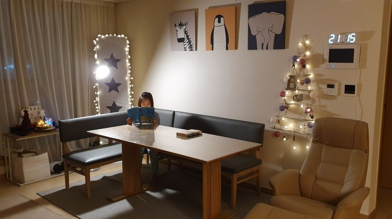 거실에는 큰 책상을 하나 준비했다. 큰 아이 그레이스가 엄마표 영어를 시작할 때가 2학년 때였다. 그래서 초등학교에 들어간 기념으로 본인 방에 예쁜 핑크 책상을 세팅해주고 거기에서 공부하도록 했었다. 그런데 엄마표 영어를 할 때는 이제 엄마가 함께하는 시간이 많아진다. 그래서 함께 편하게 앉을 수 있는 큰 책상이 필요하다. 가성비 좋은 6인용 식탁을 활용하는 것도 좋은 방법이 될 것이다. 책상에서는 주로 영어책 읽기나 집중듣기를 같이 하게 된다. 엄마가 계속 옆에 앉아있는 것은 사실상 불가능하다. 다만 엄마가 집안일을 할 때도 그 반경 안에서 아이가 하는 것을 볼 수 있으면 된다. 그래서 거실에 책상을 두는 것을 추천하는 것이다.