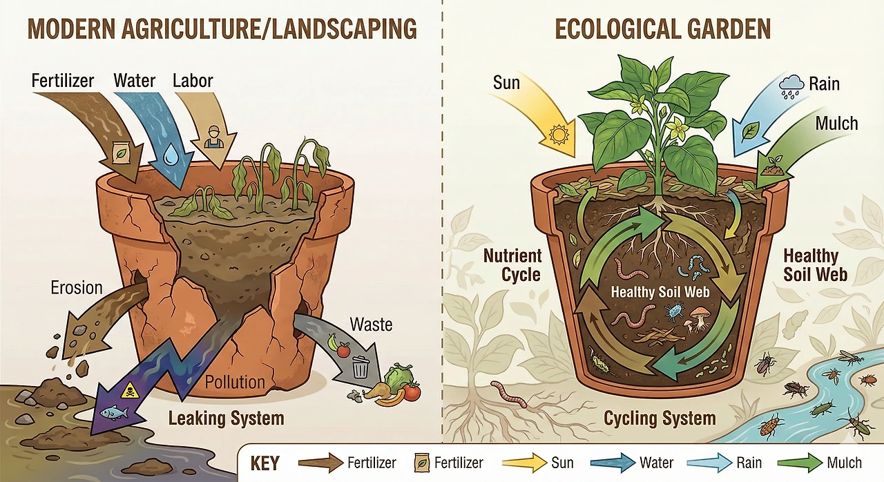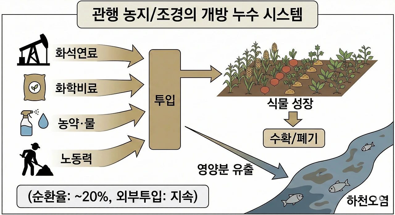 비료와 물, 노동력을 끊임없이 쏟아붓고, 낙엽과 부산물은 쓰레기로 버립니다. 밑 빠진 독에 물을 붓는 소모 시스템입니다.