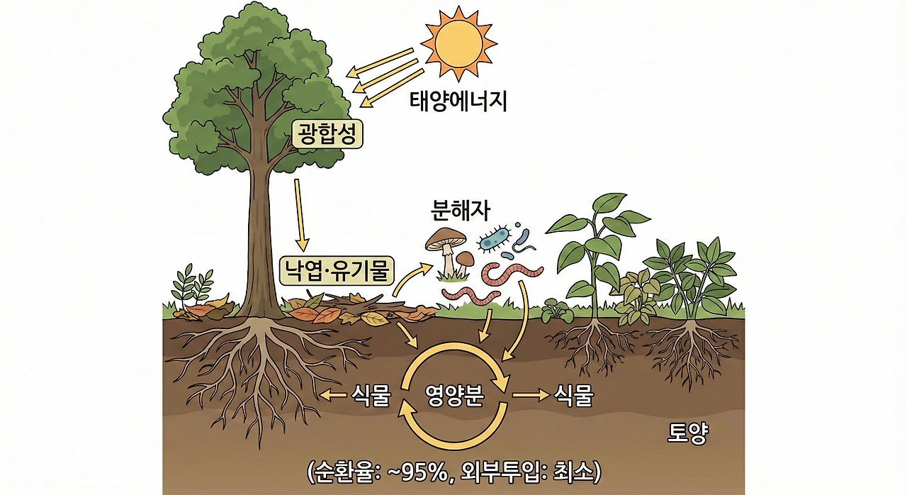 자연의 숲은 어떻습니까? 낙엽이 떨어져 흙이 되고, 그 흙이 다시 나무를 키웁니다. 외부 투입도, 폐기물 배출도 없는 완벽한 무한 동력 순환 시스템입니다.
