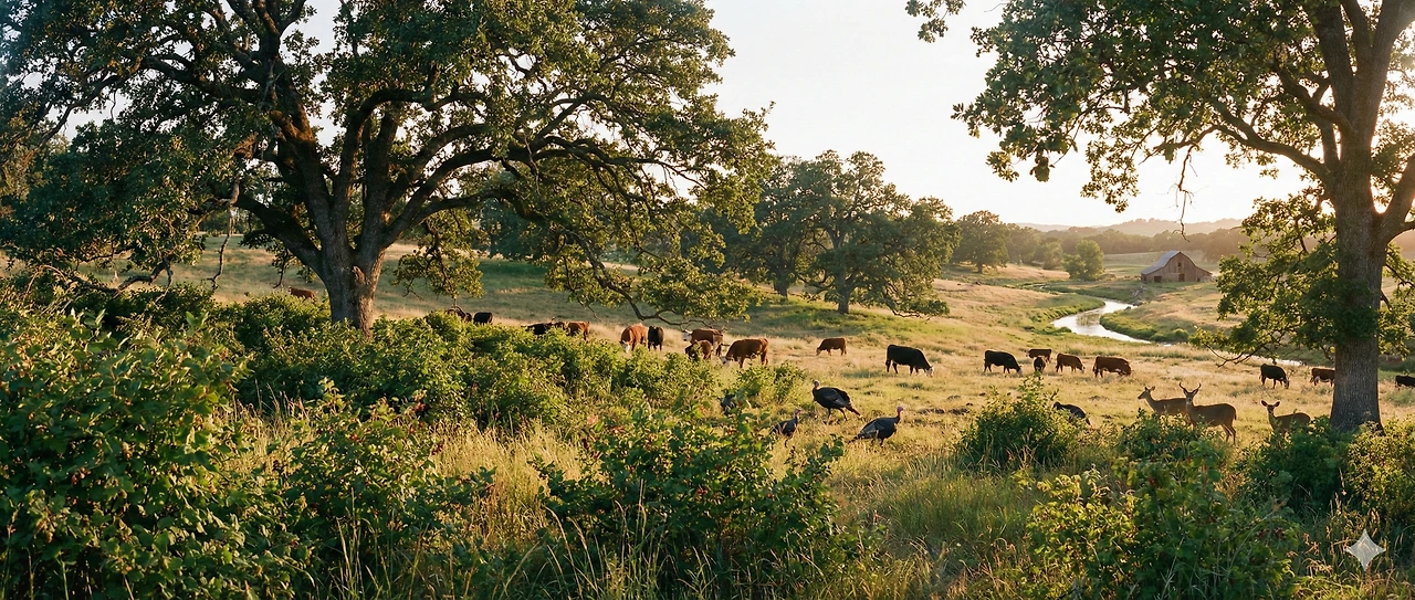 오크 사바나는 거대한 참나무(Oak)들이 드문드문 서 있고, 그 아래로 다양한 유실수와 관목, 풀들이 풍성하게 자라는 다층 구조입니다. 이 시스템은 비료나 농약, 인간의 노동 없이도 엄청난 양의 생체량(Biomass)을 생산해 왔습니다. 셰퍼드는 이 야생의 구조를 농업 시스템에 그대로 대입했습니다.