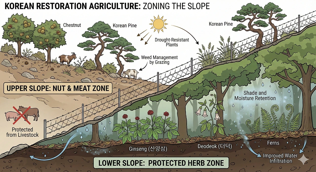 가축을 숲에 풀어놓는 것(Silvopasture)은 양날의 검입니다. 염소나 닭은 잡초를 제거해 주지만, 우리가 애써 심은 산양삼이나 더덕의 새순까지 먹어 치울 수 있습니다. 따라서 회복 농업에서는 구획(Zone)과 시기(Timing)의 관리가 필수적입니다.