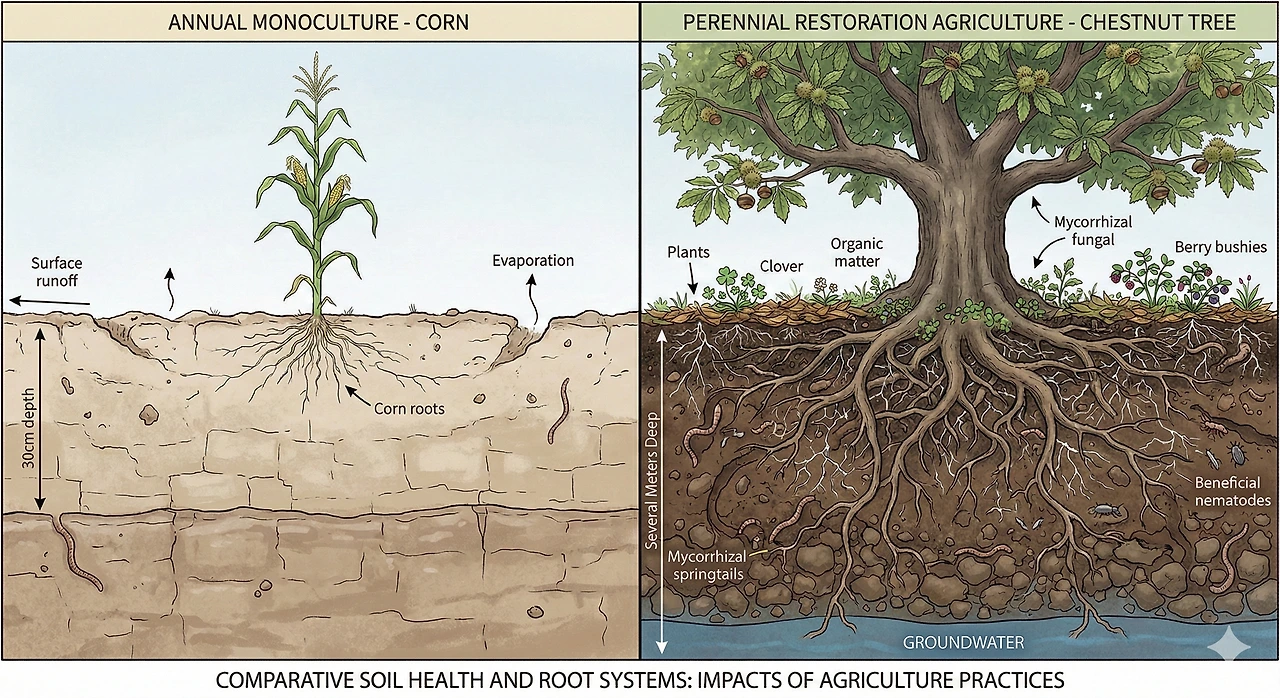 현대 농업의 비극은 1년생 작물(옥수수, 콩, 밀)에 대한 과도한 집착에서 비롯됩니다. 이들은 매년 죽고, 매년 다시 심어야 합니다. 이를 위해 인간은 매년 막대한 에너지를 들여 땅을 갈아엎고(Tillage), 종자를 사고, 비료를 뿌려야 합니다. 이는 매년 원금을 까먹고 다시 시작하는 사업과 같습니다.