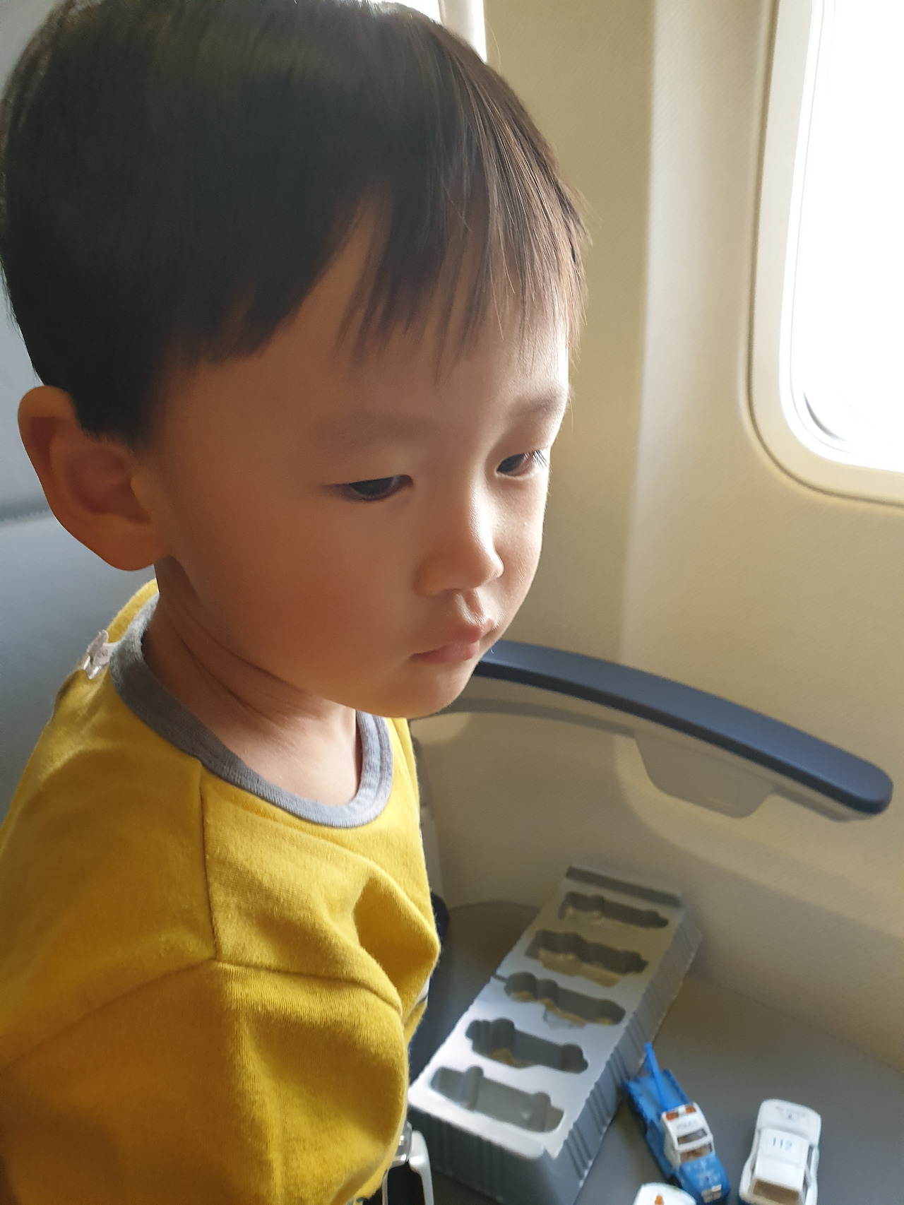 첫날. 비행기를 탄다고 하니 순순히 따라옴. 공항에 도착하니 무지 설레고 좋음. 활주로에 있는 비행기 중 아빠 비행기를 타고 싶다며 대한항공을 가리킴. 우리는 저가 항공이라 버스타고 활주로 중간에서 타야 함 그때 1차 고비. 우리는 왜 대한항공을 안타냐고 물어봄 저건 비싸라고 하기엔 쪼잔해서 작은게 더 귀엽다는 궁색한 답변을 하고 아이는 자지러짐. 비행기로 들어가는 30분이 유격훈련. 아이는 힘들다고 등에 업혀있음. 비행기에 타자 진정되는 듯 보이더니 좁다고 난리. 핸드폰 공기계에 동영상 넣어간 게 효자. 창문 밖을 보다 폭풍질문 쏟고는 잠이 듬. 급 졸림