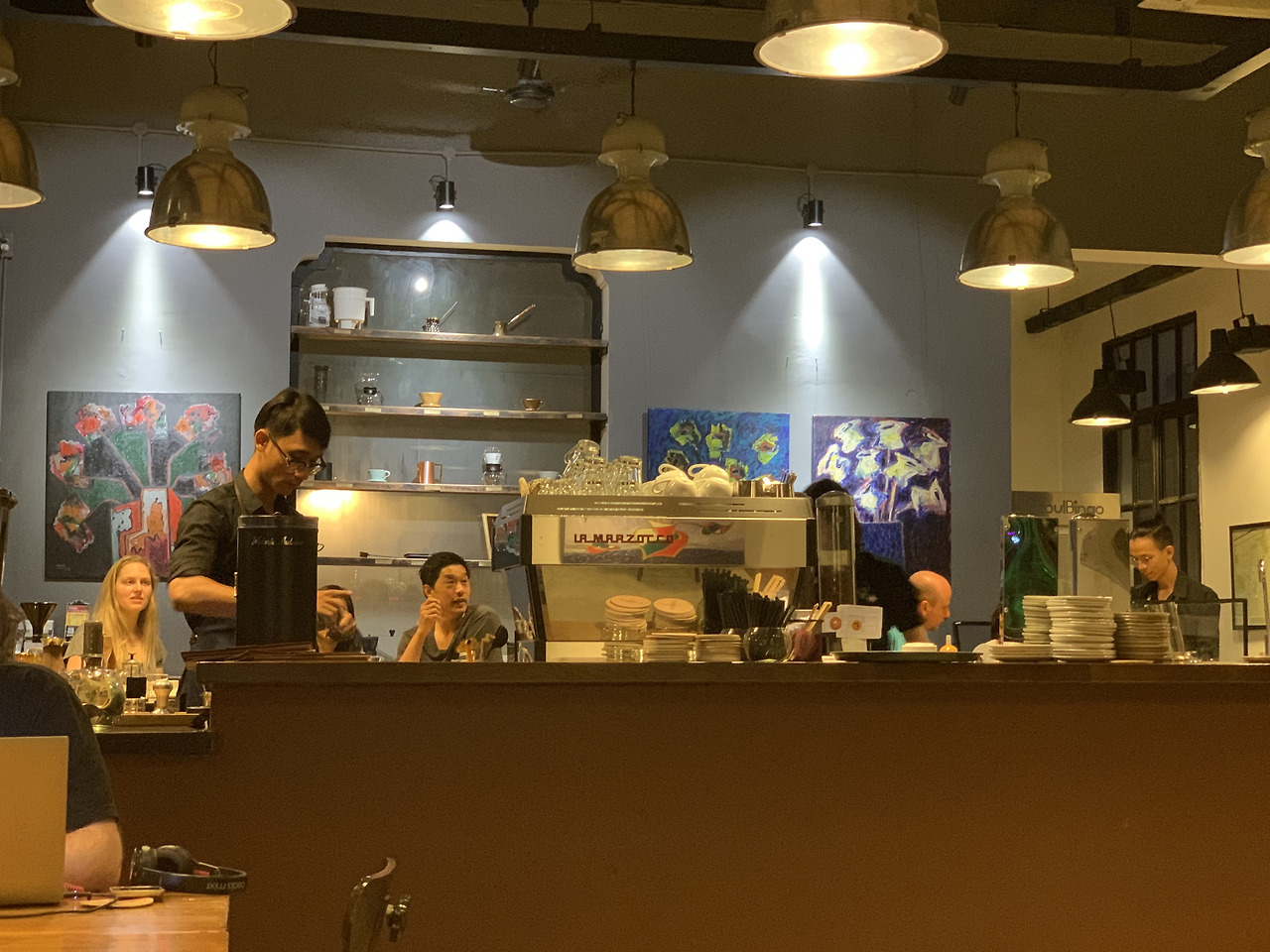 카페 안으로 들어가면, 넓고 쾌적한 공간이 눈 앞에 펼쳐진다. 한가운데 커다랗게 자리 잡은 카페 바를 중심으로 테이블들이 벽면 창가를 따라 빙 둘러 있고, 일하기 편한 크고 긴 테이블도 한 켠에 놓여 있다. 벽마다 미술 작품들이 걸려 있어, 갤러리를 겸하는 공간임을 알 수 있다. (테이블만 빼면 정말 갤러리 같다)