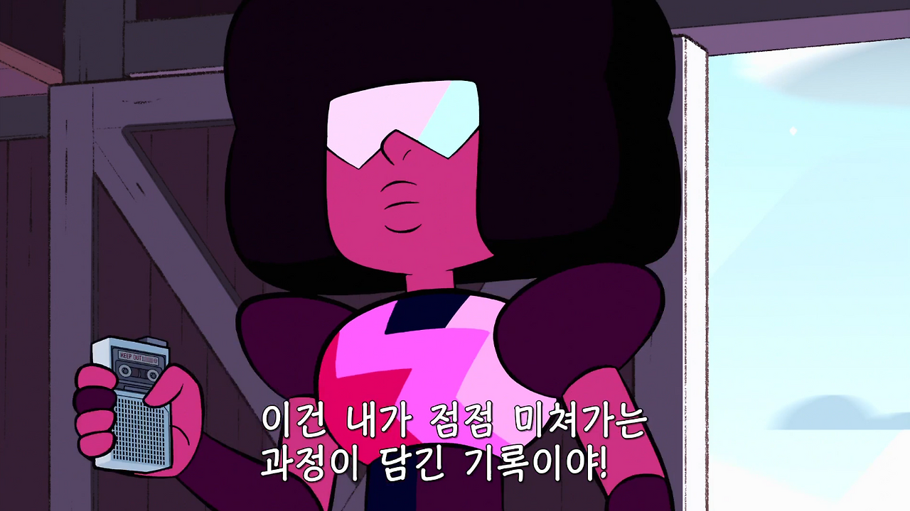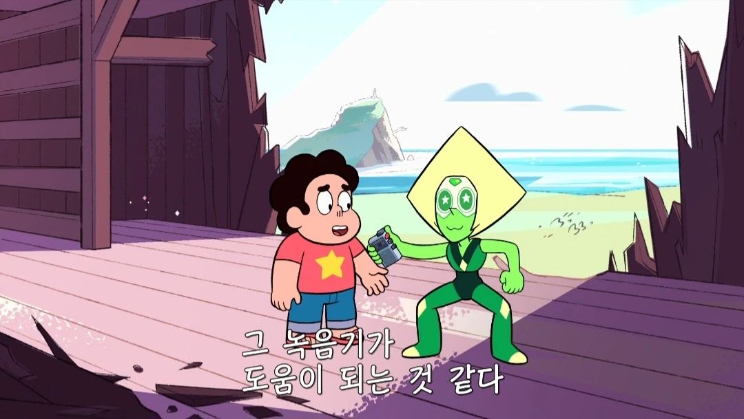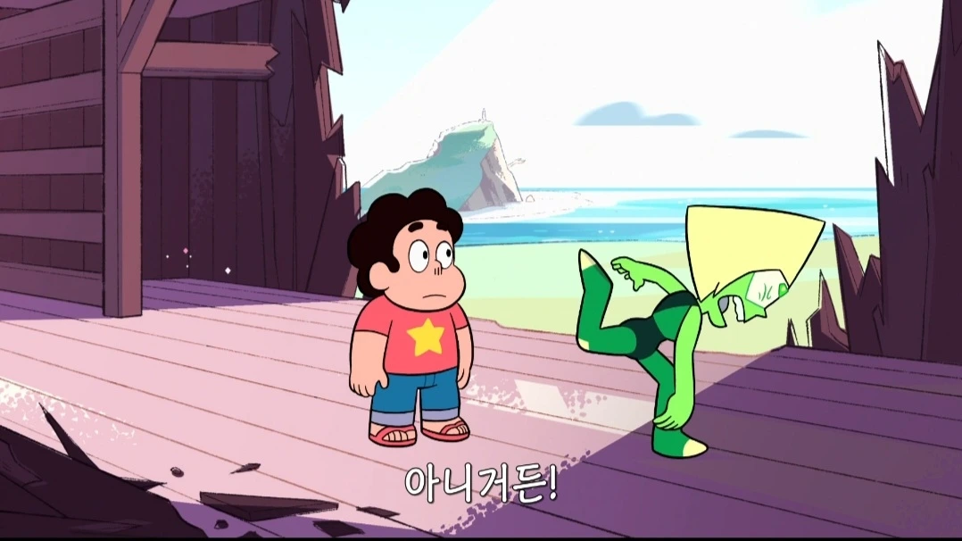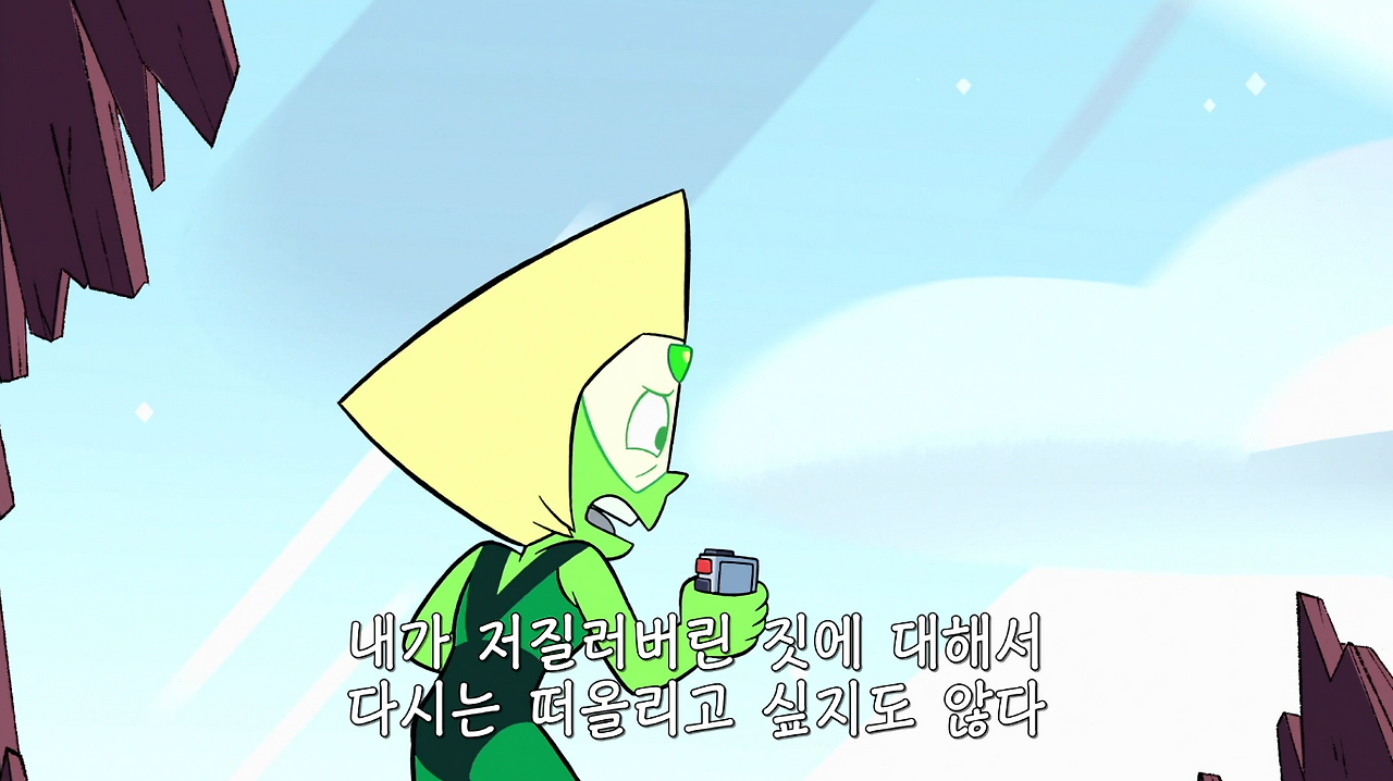 아무튼, 이 젬(gem)이라는 종족은 영어 철자에서 엿보이듯 보석을 본체로 한다. 그래서 각 인물의 이름도 보석을 따라간다. 가넷, 펄, 애머티스트 등. 그 반짝이는 인물들 중에서 나는 페리도트를 좋아했다. 작은 체구에 삼각형 머리(스티븐의 표현에 따르면 '화난 파이조각 같은'), 동그랗지만 시시때때로 뾰족해지는 눈이 무척 깜찍한 젬이다. 지구를 식민지로 만들라는 상사에게 돌대가리라고 욕하고 명령에 불복하는 패기를 보이기도 했다.