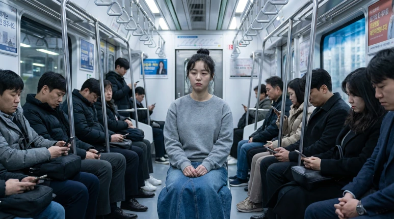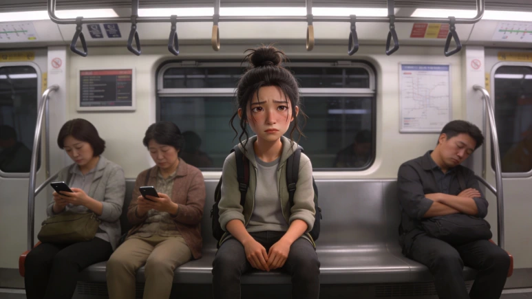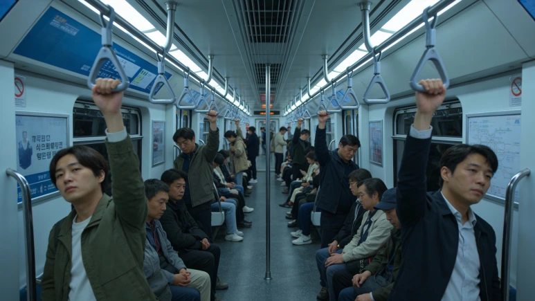 2️⃣ '지하철에서 사람들 사이에 앉아있는 주인공의 모습'