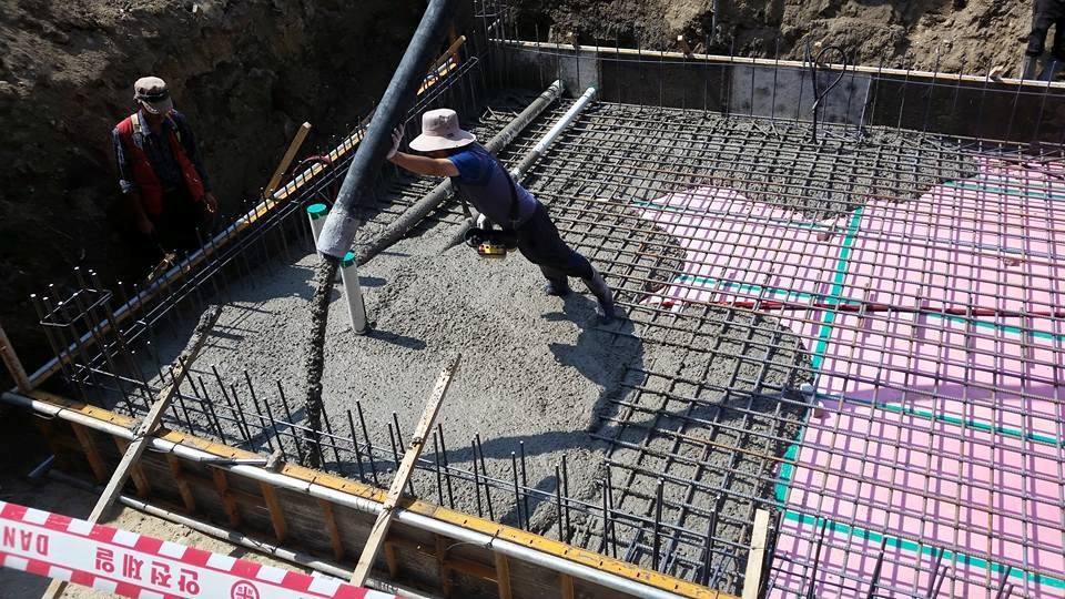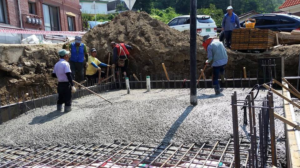 철근 배근이 끝난 후 레미콘 차량을 불러 콘크리트 타설에 들어간다.