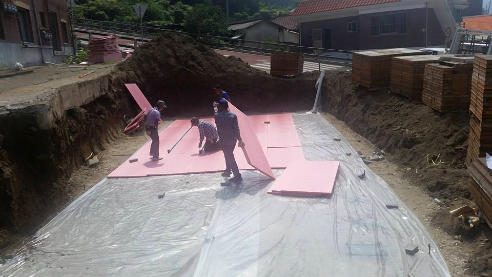 바닥이 정리된 후 바로 바닥 기초 단열작업에 들어갔다.
