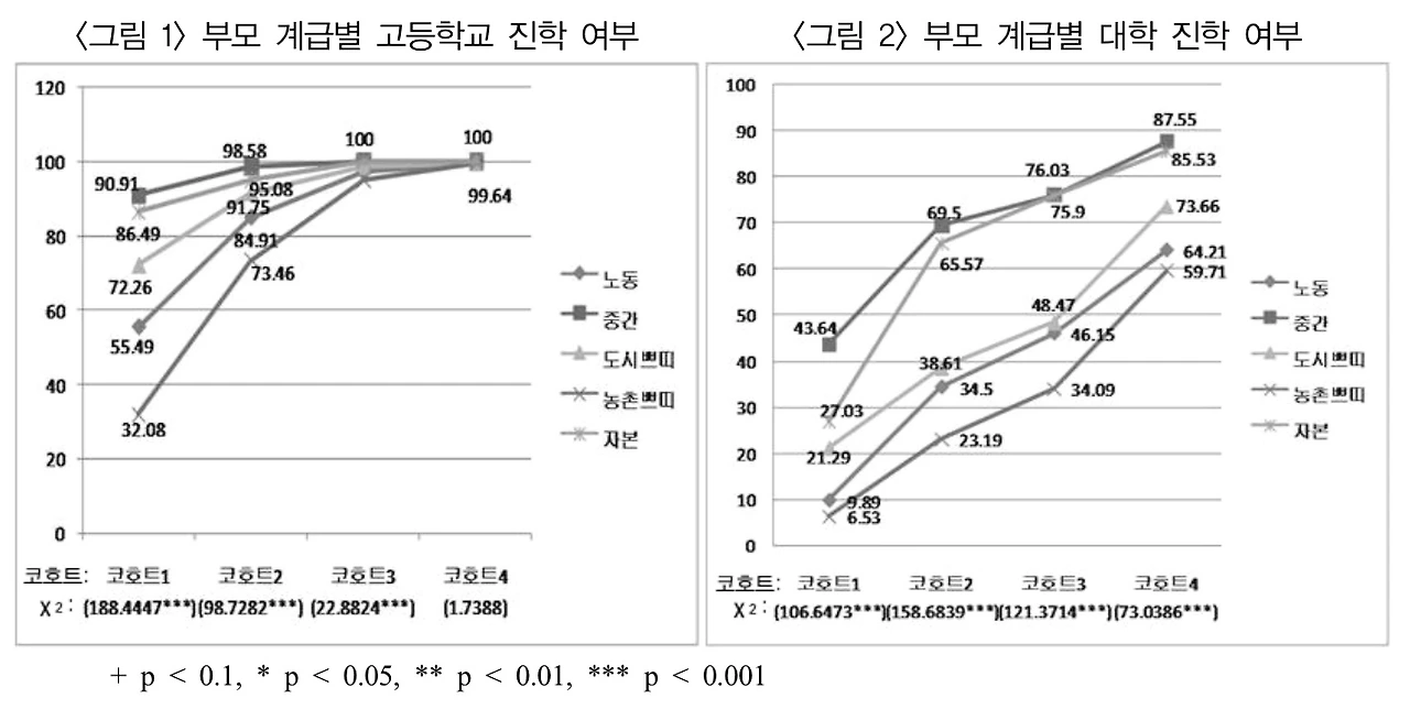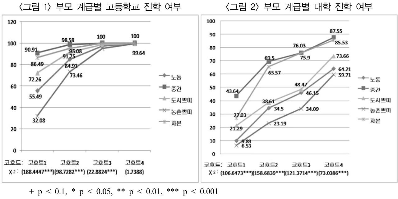 여기서 우리가 집중해야 할 것은 코흐트 2 이다. 우선, 진학 여부를 보면 고등학교 진학 여부의 계급 차이(<그림 1>)는 코호트를 거치며 거의 사라졌다. 코호트 4의 응답자들이 고등학교에 진학하는 1990년대는 고등학교 진학률이 95% 이상으로(한국교육개발원, 2015 : 53), 완전 취학이 이루어지면서 고교 진학 여부의 계급 간 불평등은 사라진 것을 알 수 있다.