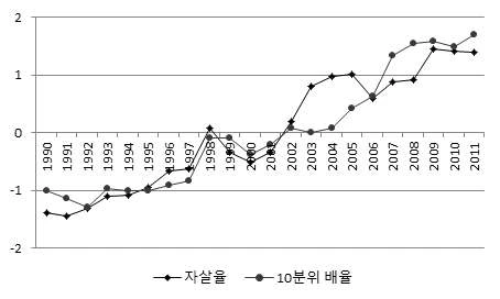 위 표는 인구 10만 명당 자살자 수와 소득 10분위 배율의 연도별 추이를 보여주고 있다. 두 그래프는 모두 같이 상승하며 유사한 궤적을 보였다. 이는 사회적 타살 현상이 소득 불평등 수준은 명백하게 연결되어 있음을 보여준다. 이러한 분석의 결과는 오늘날 진행되고 있는 사회문제의 일면만을 보여 주는 것이다. 초저출산율과 높은 범죄율 등 나쁜 수치들이 자살률과 함께 오르고 있으며, 여러 현상은 갈수록 악화하고 있다.