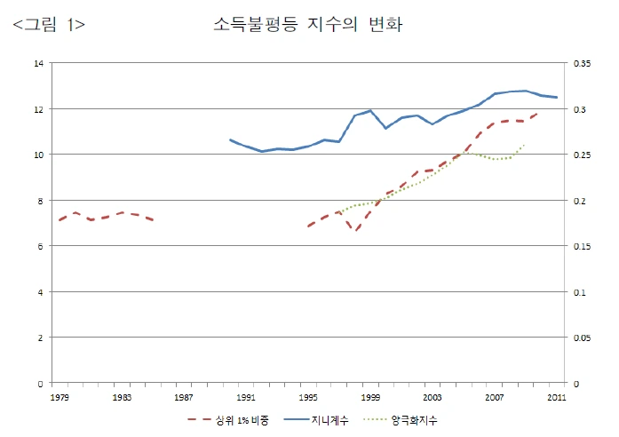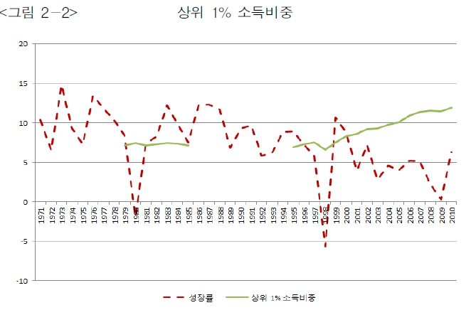 위 그래프에서 볼 수 있다시피 지니계수와 상위 1% 소득 비중이 성장률과 반비례하는 것을 볼 수 있다.