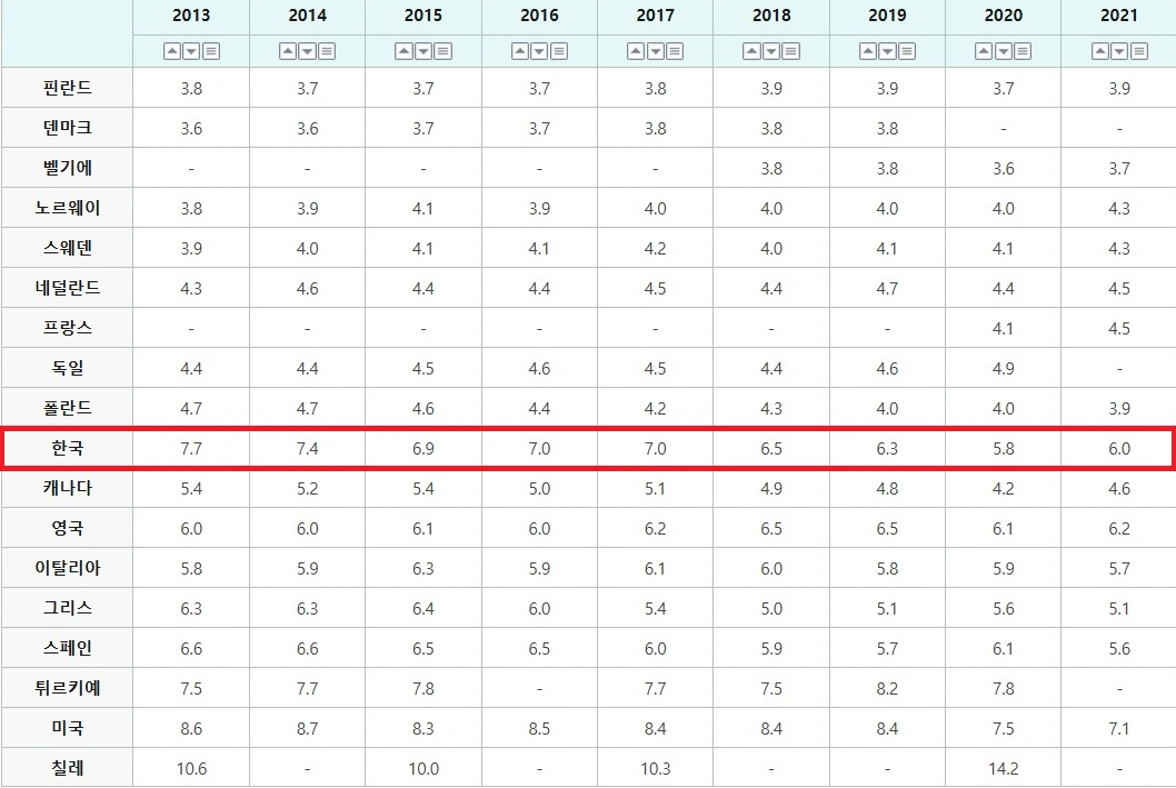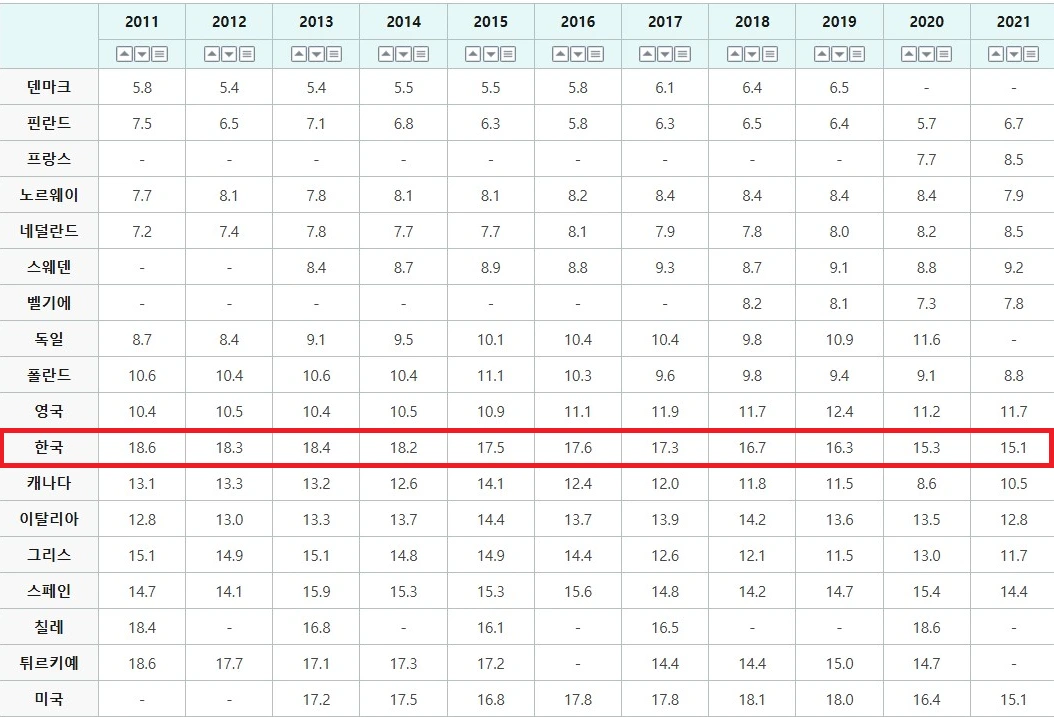또한 OECD 자료로 보면, 2021년 기준 한국의 상대적 빈곤율(15.1%)은 미국(15.1%)과 같고, 영국(11.7%), 스웨덴(9.2%), 핀란드(6.7%) 등에 비해서는 약 2배 이상의 높은 모습을 보인다.