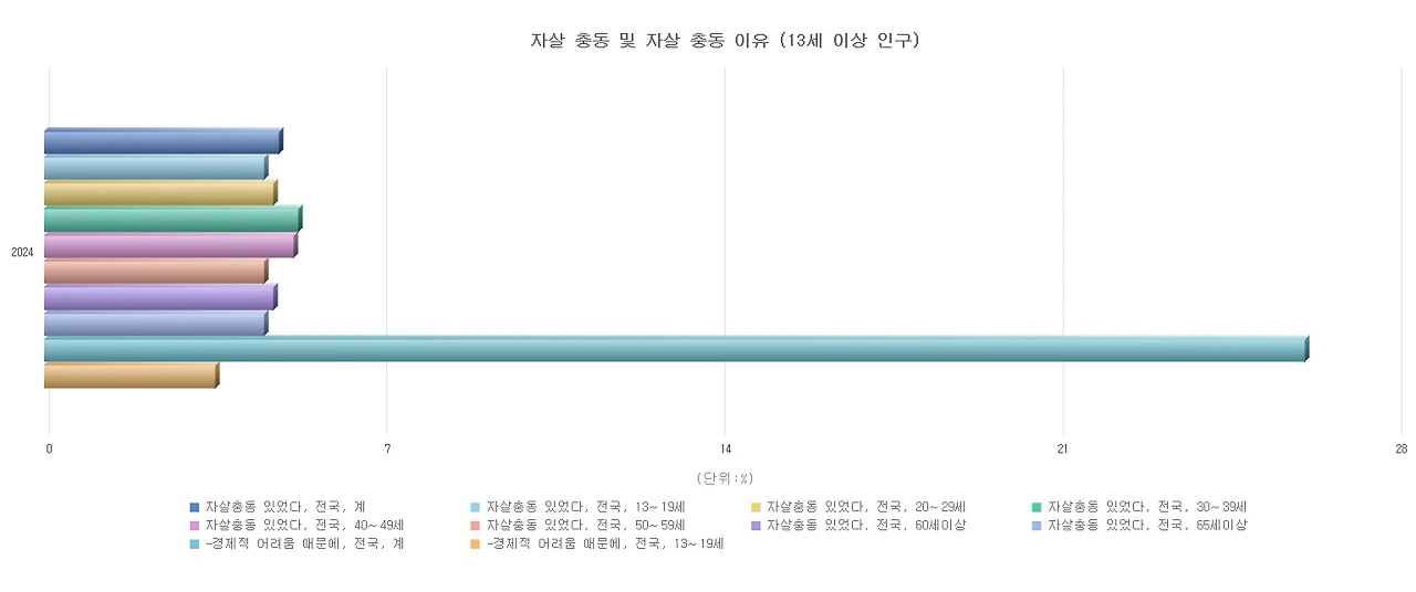 통계청에서 매년 발간하는 “사회조사보고서”는 2년마다 우리나라 국민의 자살충동과 원인에 관한 응답 결과를 포함하고 있다. 2024 보고서에 따르면 전국 전체 연령 중(13세 이상) 4.8가 자살 충동이 있었다고 답하였고, 주된 이유는 경제적 어려움 25.8%, 직장 문제(실직, 미취업, 업무, 스트레스) 11.2%, 외로움 9.0%, 가정불화 8.0%, 학교 성적 또는 진학 문제 2.9%였다. 이러한 결과는 2010년과 2012년 보고서에도 동일하게 확인되며, 자살 충동(7.7%→9.2%), 경제적 어려움(38.8%→39.5%) 항목에 대한 선택 비중이 점차 확대되고 있다. 자살 현상이 빈곤, 사회적 배제, 불평등 수준과 관련이 있다는 것을 보여주는 결과이다.