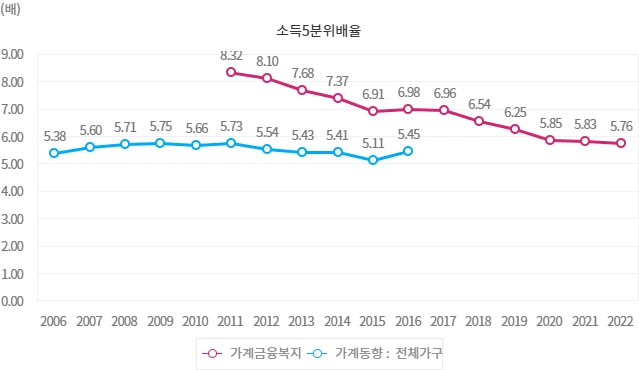 2016년의 경우 소득 5분위 배율은 각 자료에 대하여 5.45와 6.98로 나타났다. 「가계금융복지조사」의 결과를 기준으로 보면 최상위 20%가 최하위 20%의 7배에 달하는 소득을 얻고 있는 것이다. 소득 5분위 배율도 지니계수와 마찬가지로 점차 개선되다가 2016년에는 오히려 전년대비 악화되는 모습을 보이고 있다.