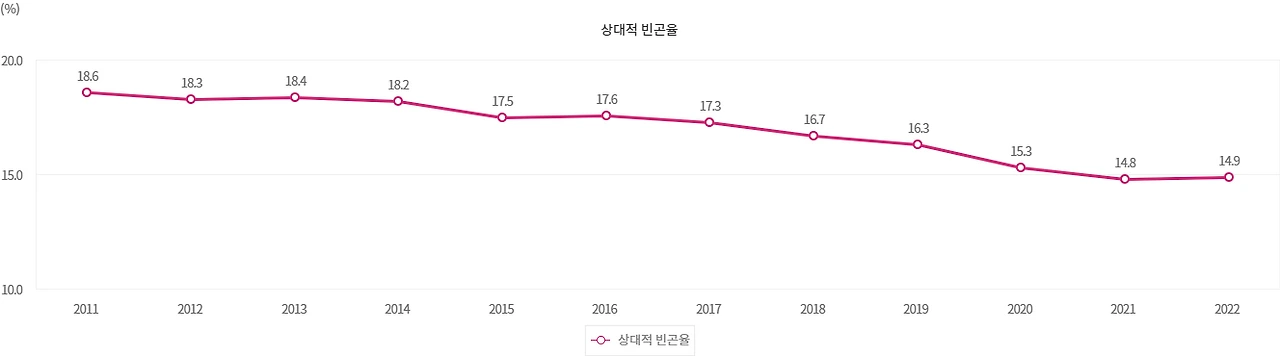 그리고 통계청의 가계금융복지조사를 자료를 기반으로 계산한 것을 살펴보면 2022년 14.9%로 지난 2011년