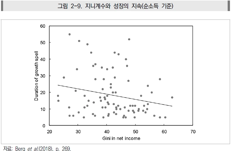 IMF에 관한 Ostry, Berg, and Tsangarides(2014)와 Berg et al.(2018) 등의 연구 결과는 불평등의 정도가 높을수록 10년 평균 성장률로 본 장기 성장률이 하락하고 있음을 보여준다. 또한 불평등도가 높을수록 성장의 지속 기간이 짧아짐을 보여줌으로써 소득 불평등이 경제 성장에 악영향을 끼친다는 것을 보여주었다.