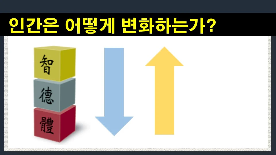 뇌가 하는 일은 기본적으로 바깥에서 오는 정보를 알아차리는 것이니, 그 바깥의 대표적인 것이 바로 인체이기 때문이다. 그래서, 인간의 변화는 지덕체(智德體)가 아닌 체덕지(體德智) 이다. 즉, 몸으로부터의 출발이다.