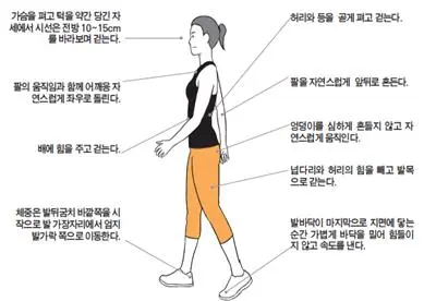 결국, 잘못된 걷기는 몸의 피로와 체형 불균형, 하지근육의 근력약화를 초래하고 무릎 관절염, 척추측만증, 거북목 등 다양한 병의 원인이 되기도 한다. 아래 그림을 참조하여 바른 자세를 의식하면서 걸어보자.