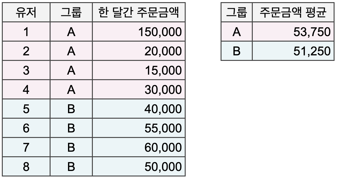 보통 우리가 회사에서 당면하게 되는 데이터는 한눈에 다 담을 수 없을 만큼 크기 때문에, 적절하게 집계해서 사용하는 것이 일반적입니다. 예를 들어, A그룹과 B그룹을 비교한다고 하면 보통 두 집단에 속한 유저들의 수치를 하나하나 들여다보는 대신 { A그룹 평균 vs B그룹 평균 } 이런 식으로 대표적인 값을 집계해 비교하게 되죠.