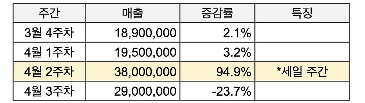자, 그러면 이번에는 앞선 주간들의 수치까지 함께 살펴보겠습니다. 이렇게 보니 어떠신가요? 4월 2주차가 세일 주간이었기 때문에 이번주의 수치가 기저 효과로 크게 하락해 보이는 것뿐이라는 걸 알 수 있습니다. 그리고 오히려 평주간인 3월 4주차나 4월 1주차와 비교하면 매출이 꽤 많이 증가한 상황이죠. 처음에 전주 대비 증감률만 보고 단편적으로 생각했던 것과 달리 위기 상황이 아니며 오히려 상황은 긍정적으로 보입니다.