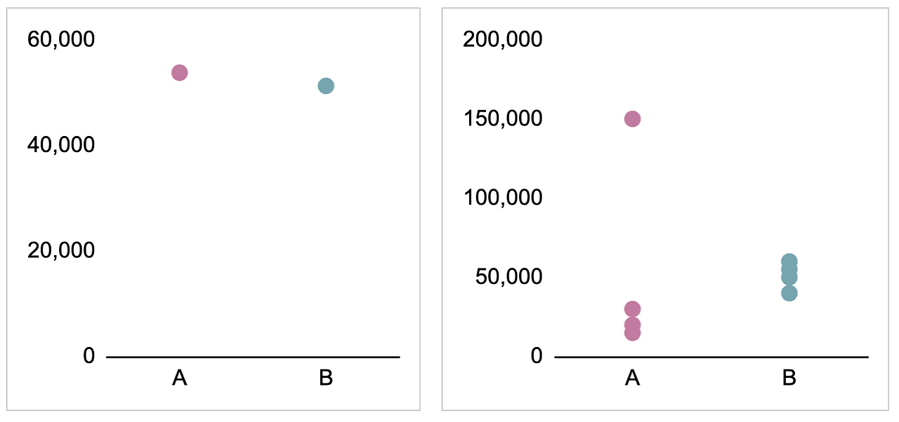 위와 같은 결과를 볼 때 생각보다 많은 분들이 평균값에만 주목하고 결론을 내려하십니다. "A그룹은 53,750원이고 B그룹은 51,250원이니까, A그룹 성과가 더 좋았네!" 이런 식으로요. 이게 바로 데이터를 점으로 보는 사고방식으로, 그래프 상에 53,750원 그리고 51,250원이라는 두 개의 점만 찍고 이 둘만 비교하려 하는 것이죠. 하지만 유저의 전체적인 수치를 살펴보면 사실 1번 유저를 제외하면 A그룹의 성과가 B그룹에 비해 전반적으로 낮다는 걸 눈치챌 수 있습니다. 이런 상황에서 "A그룹이 성과가 더 좋으니, A 쪽으로 가자"라고 의사 결정을 한다면 실제로는 B로 결정할 때보다 성과가 악화될 수도 있겠죠.